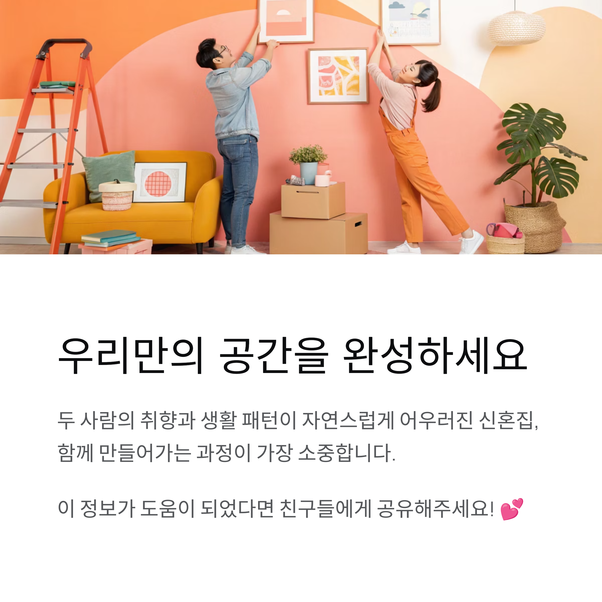 신혼집 인테리어는 단순히 예쁘게 꾸미는 것을 넘어서, 앞으로의 삶의 방향과 감성을 함께 설계하는 일이라고 생각해요. 처음 함께 사는 공간이기에 두 사람의 취향과 생활 패턴이 자연스럽게 어우러져야 하죠. 그래서 어떤 스타일을 고르든, 가장 중요한 건 '함께' 만들어가는 과정이에요.