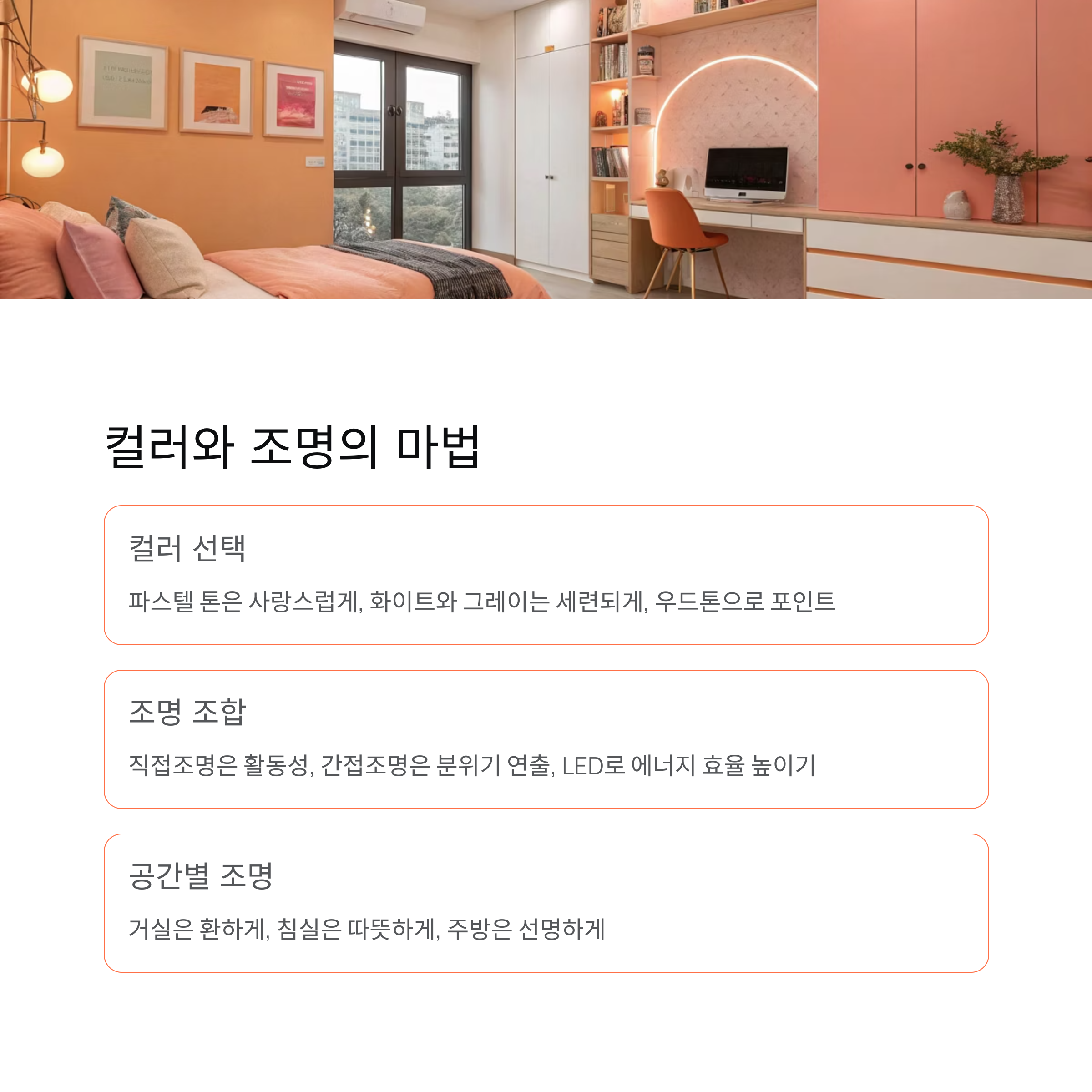 조명은 직접조명과 간접조명을 적절히 섞는 게 포인트예요. 주 조명은 활동성을 높이는 하얀색 계열로, 간접조명은 분위기를 만드는 노란색 계열이 좋아요. 스탠드 하나만 잘 둬도 그 방의 무드가 완전히 달라지죠!