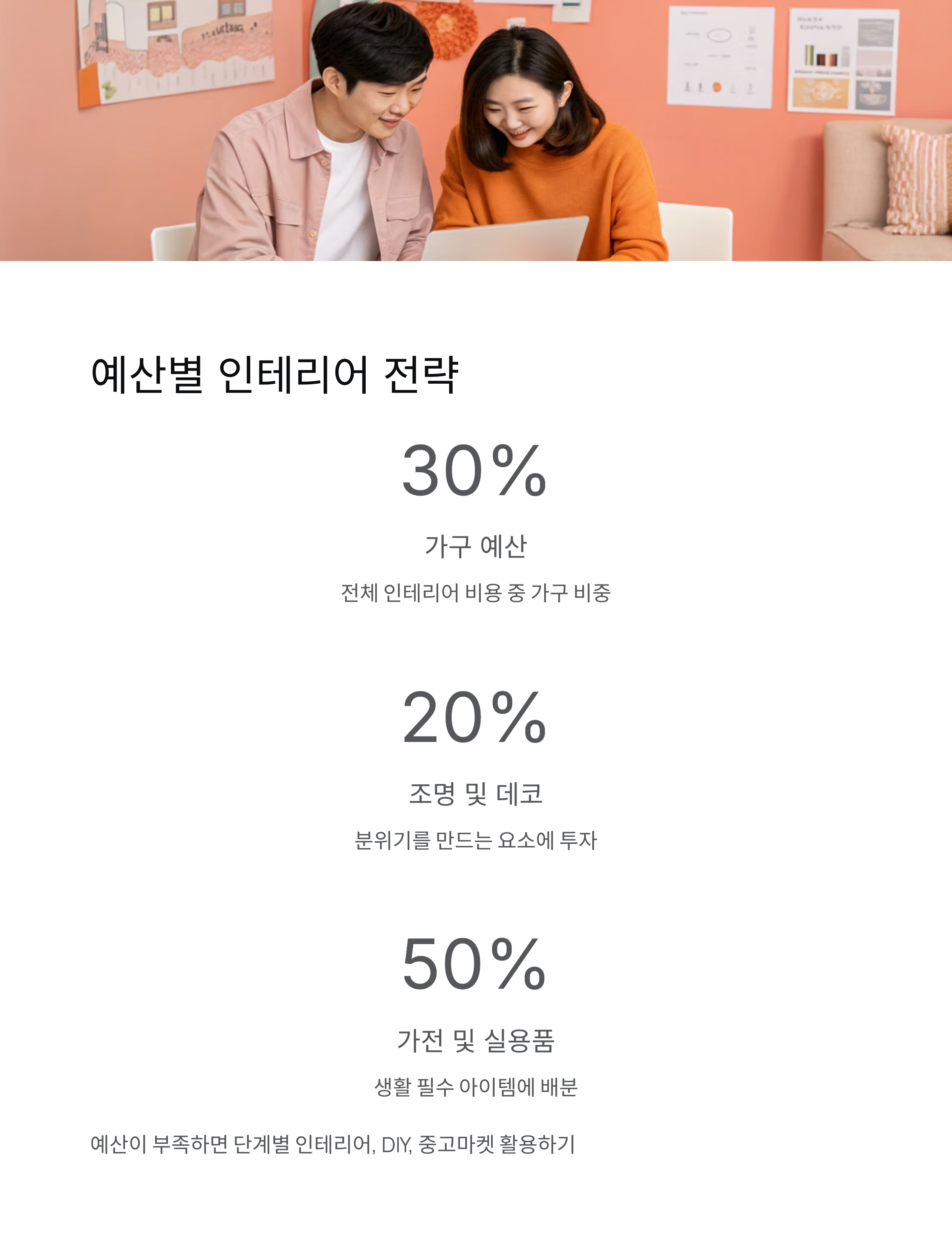 신혼집 인테리어에서 가장 현실적인 고민이 바로 ‘예산’이에요. 아무리 꿈꿔오던 스타일이 있어도, 실제로 실행에 옮기려면 돈이 들죠. 그래서 예산을 세분화해 계획하는 게 정말 중요해요. 무턱대고 가구부터 사기 시작하면 금방 예산 초과되기 쉽거든요.