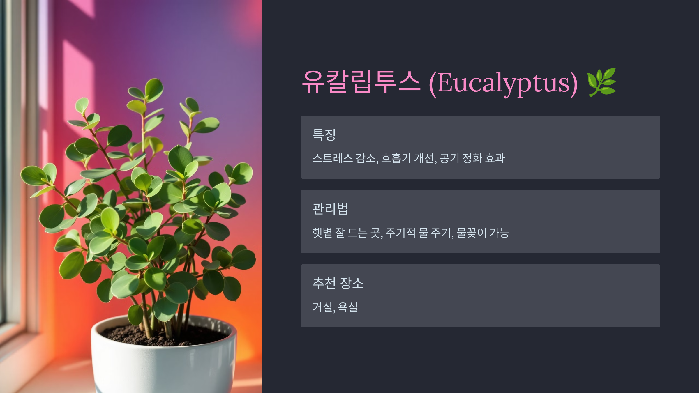 유칼립투스는 상쾌하고 독특한 향기로 실내 공기를 정화해줍니다.