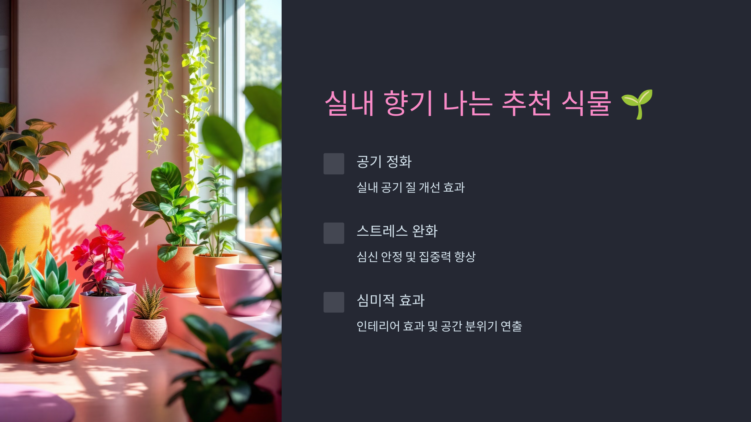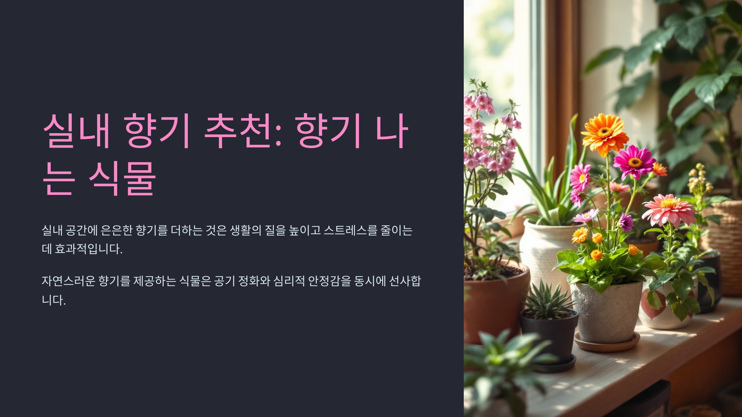 실내 공간에 은은한 향기를 더하는 것은 생활의 질을 높이고 스트레스를 줄이는 데 효과적입니다. 자연스러운 향기를 제공하는 식물은 공기 정화와 심리적 안정감을 동시에 선사합니다. 오늘은 실내에서 키우기 좋은 향기 나는 식물들을 소개하며, 각 식물의 특성과 관리 방법까지 알아보겠습니다.