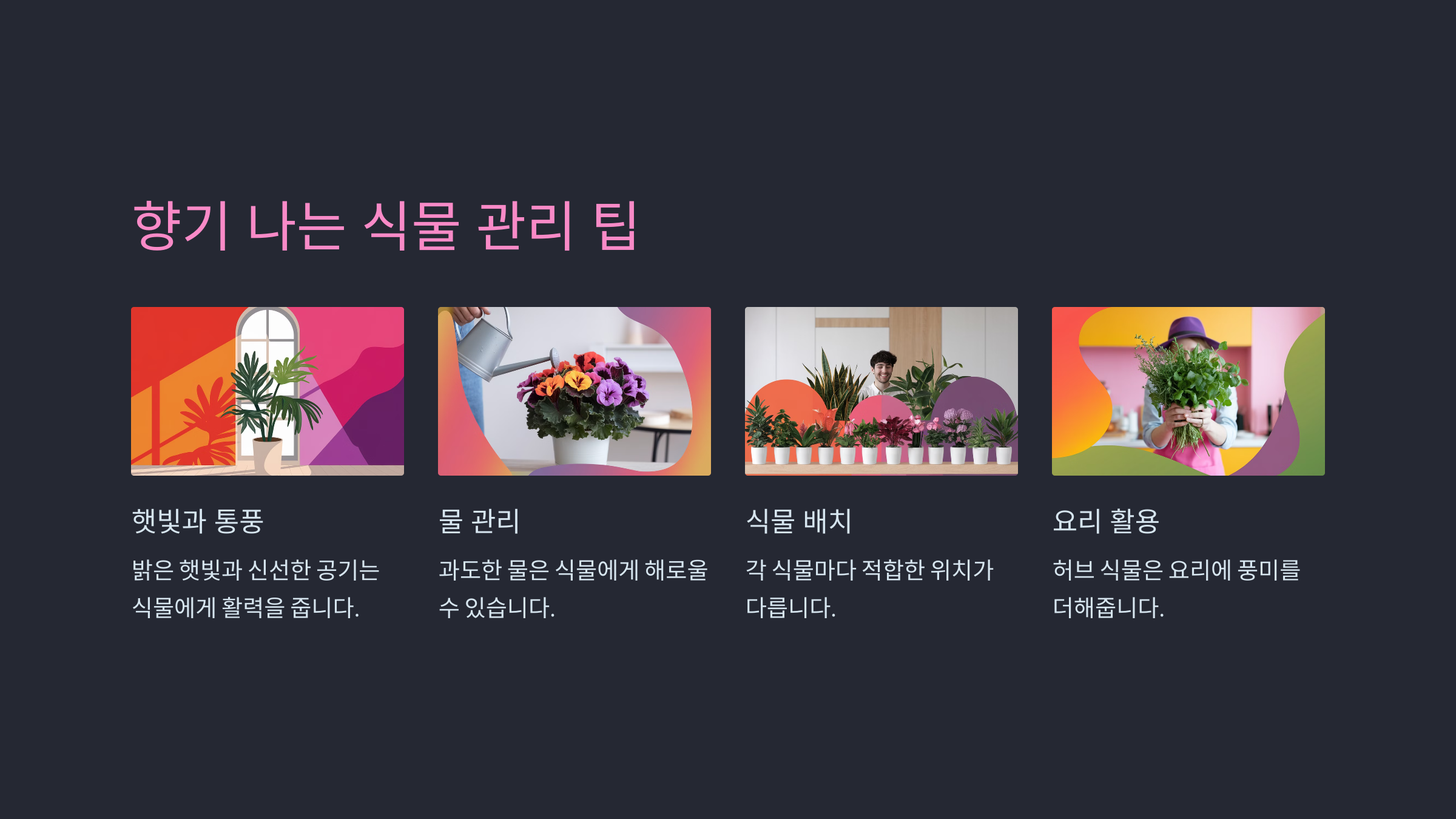 과도한 물은 식물을 시들게 할 수 있습니다. 흙 상태를 주기적으로 확인하고, 식물에 맞는 물 주기와 양을 맞춰 관리하세요.