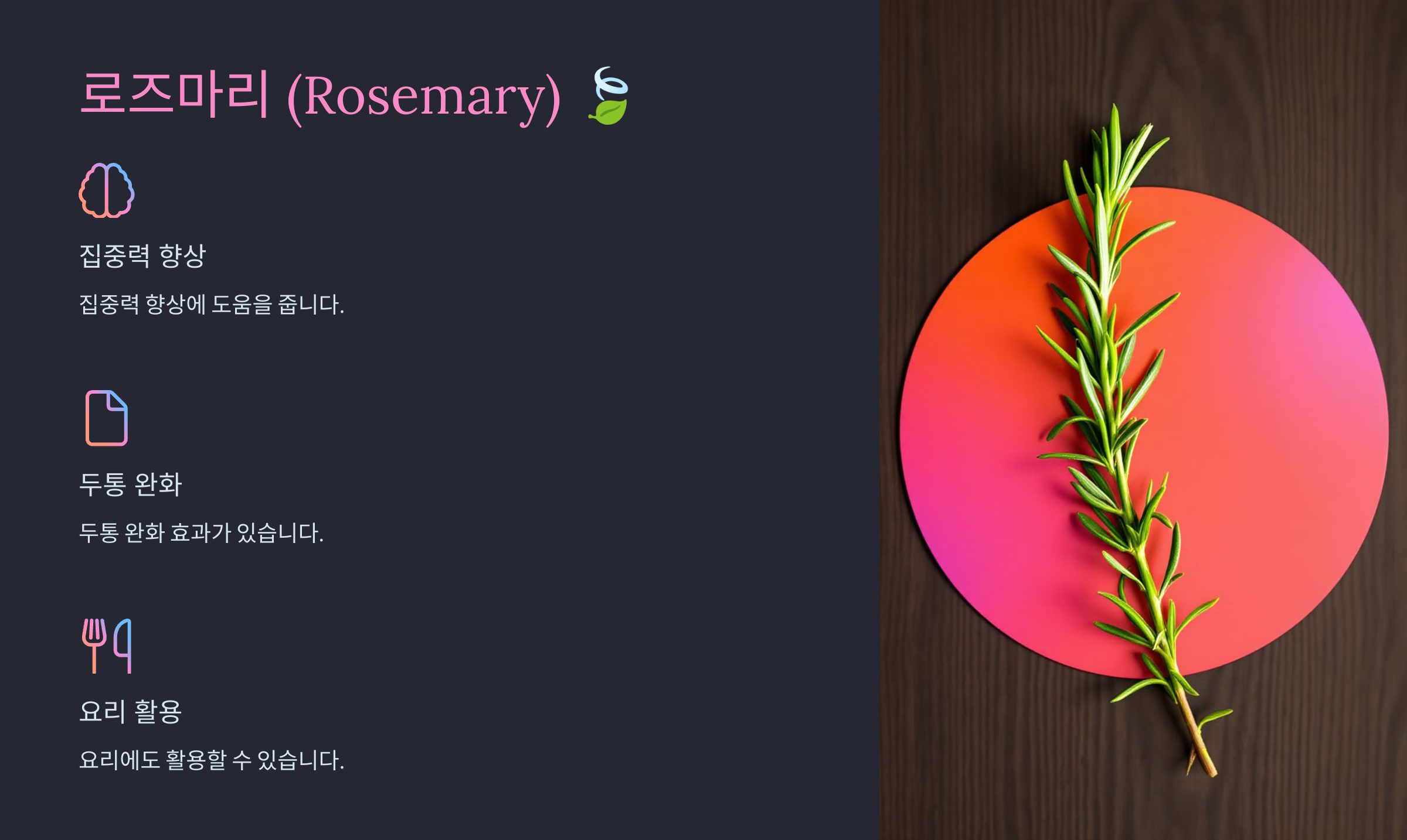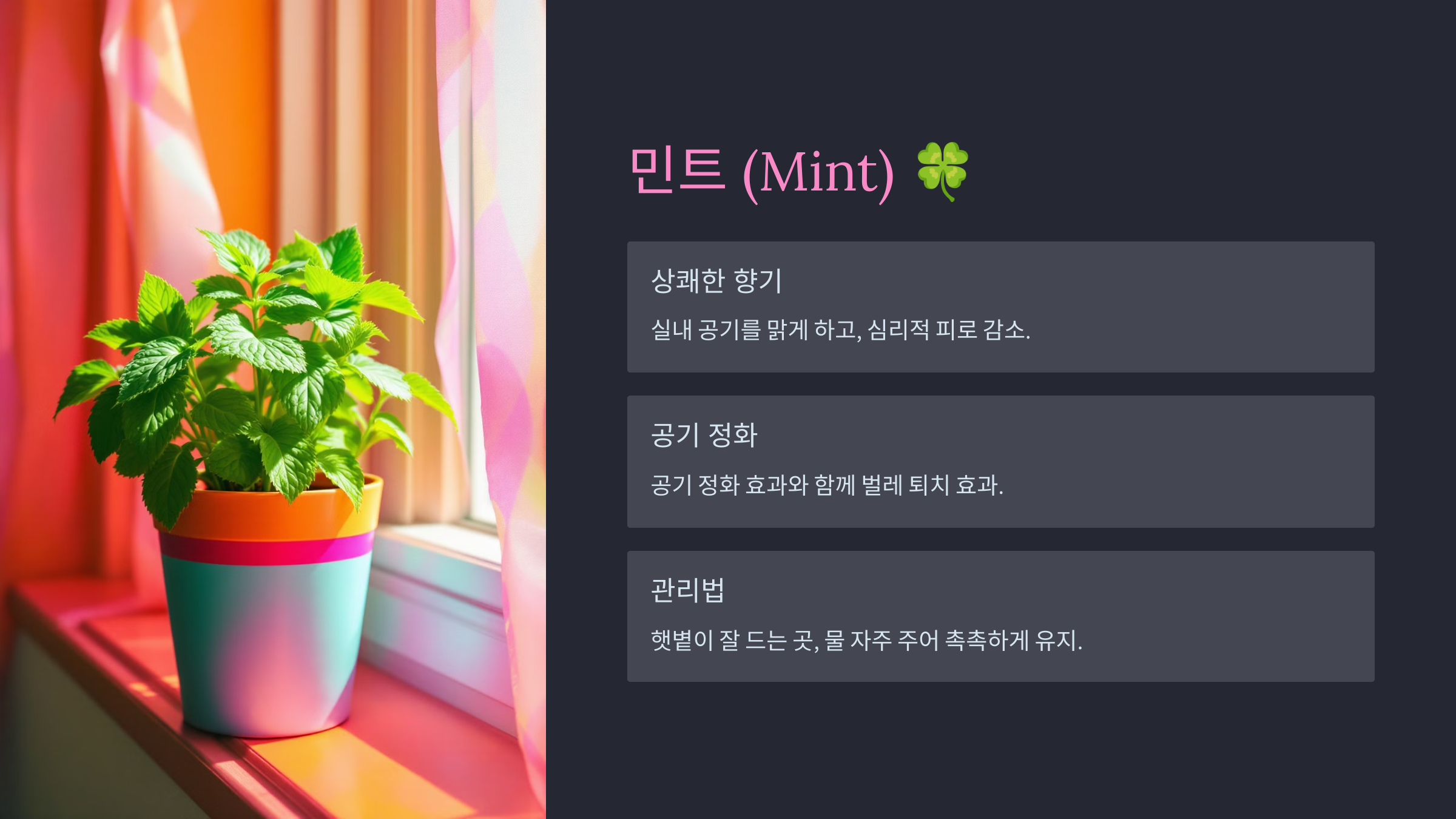 - 특징: 두통 완화와 집중력 향상에 효과적이며, 요리에도 활용할 수 있습니다.