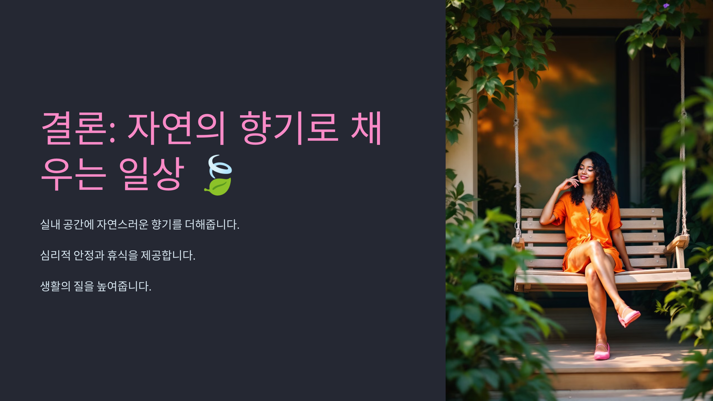 - 특징: 우울감 해소와 스트레스 완화에 도움을 줍니다. 또한 공간을 향긋하게 만들어줍니다.
