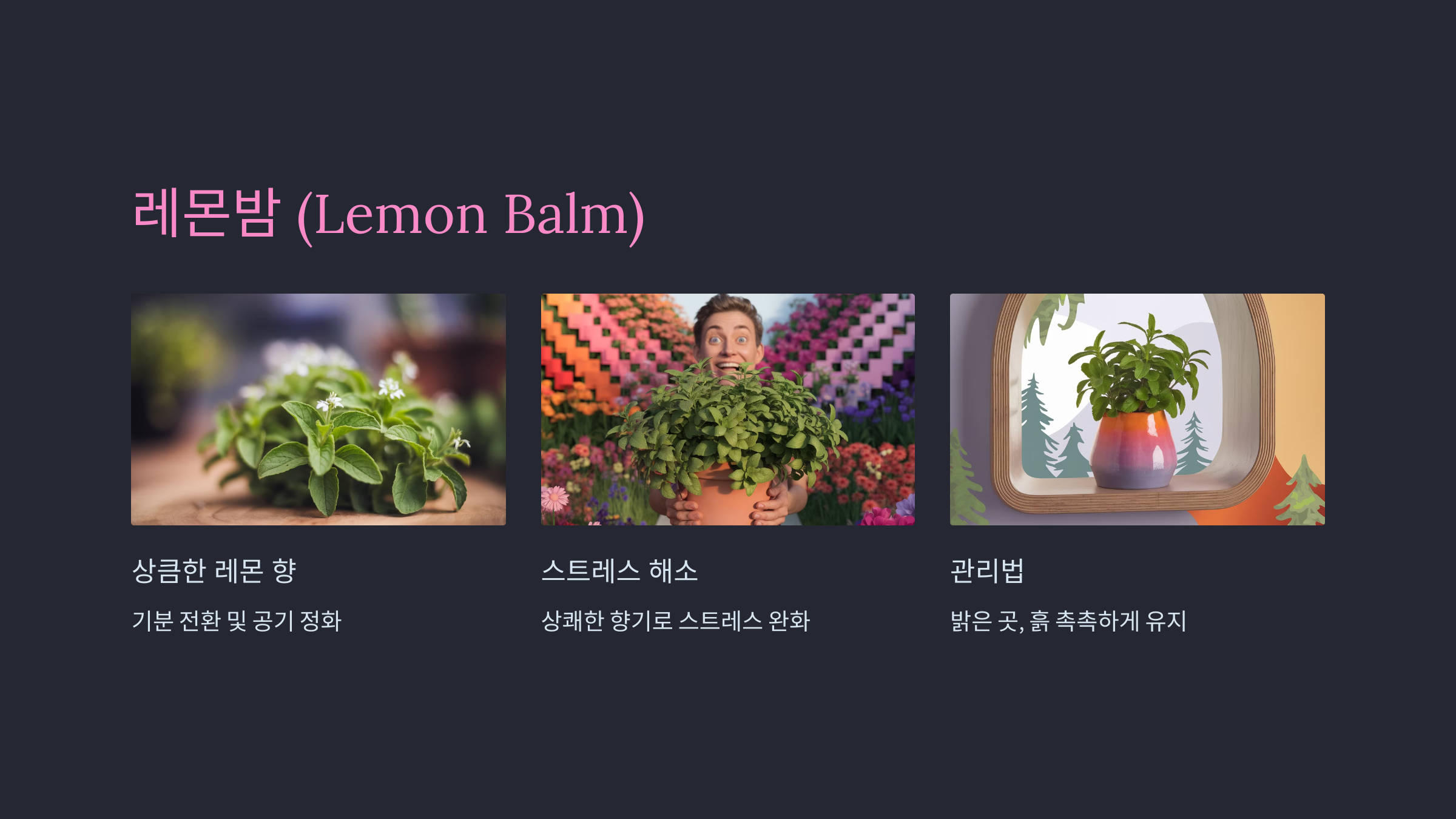 레몬밤은 레몬처럼 상큼한 향기로 기분 전환과 공기 정화에 좋습니다.