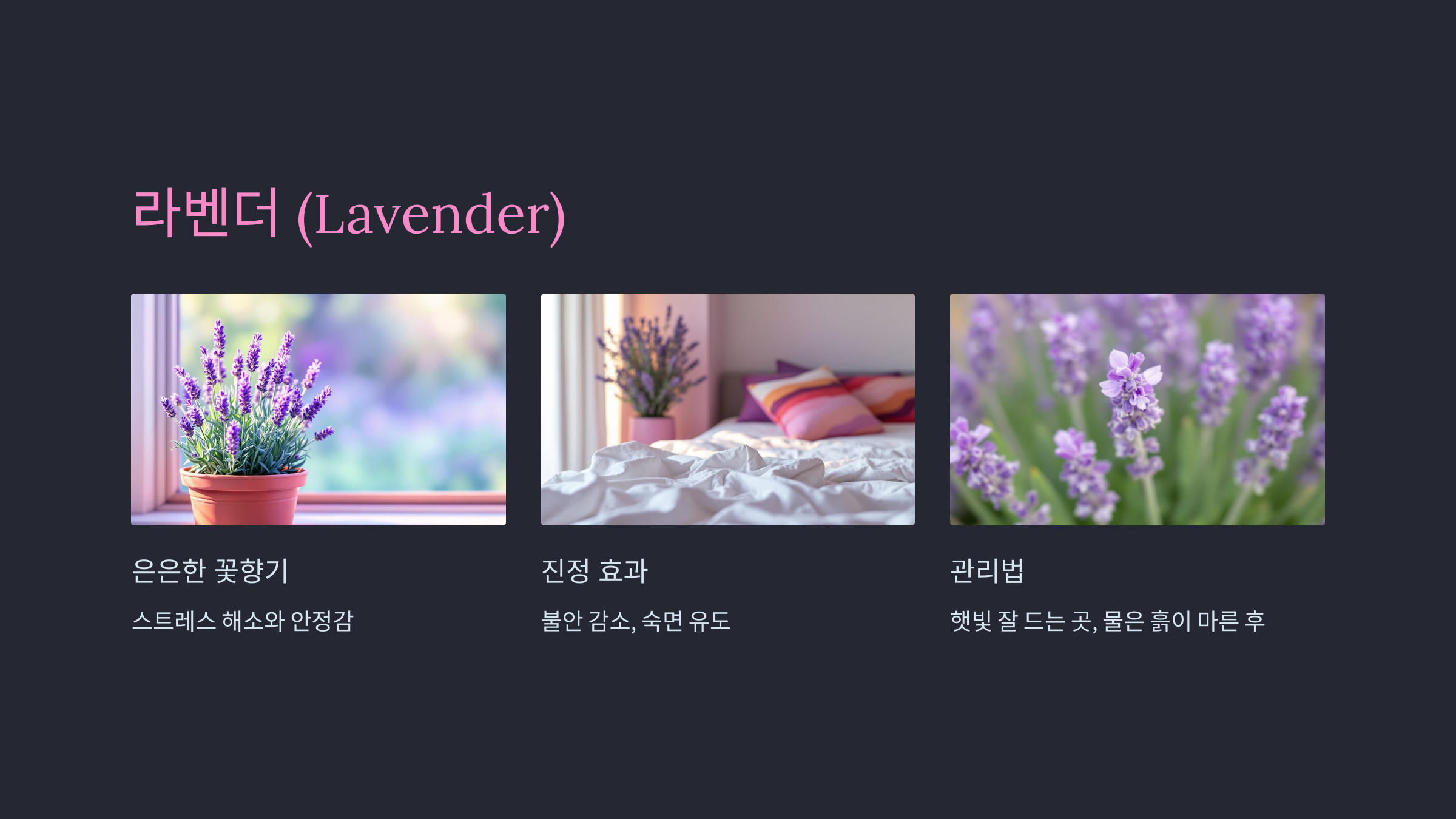 라벤더는 은은한 꽃향기로 스트레스 해소와 안정감을 주는 식물로 유명합니다.