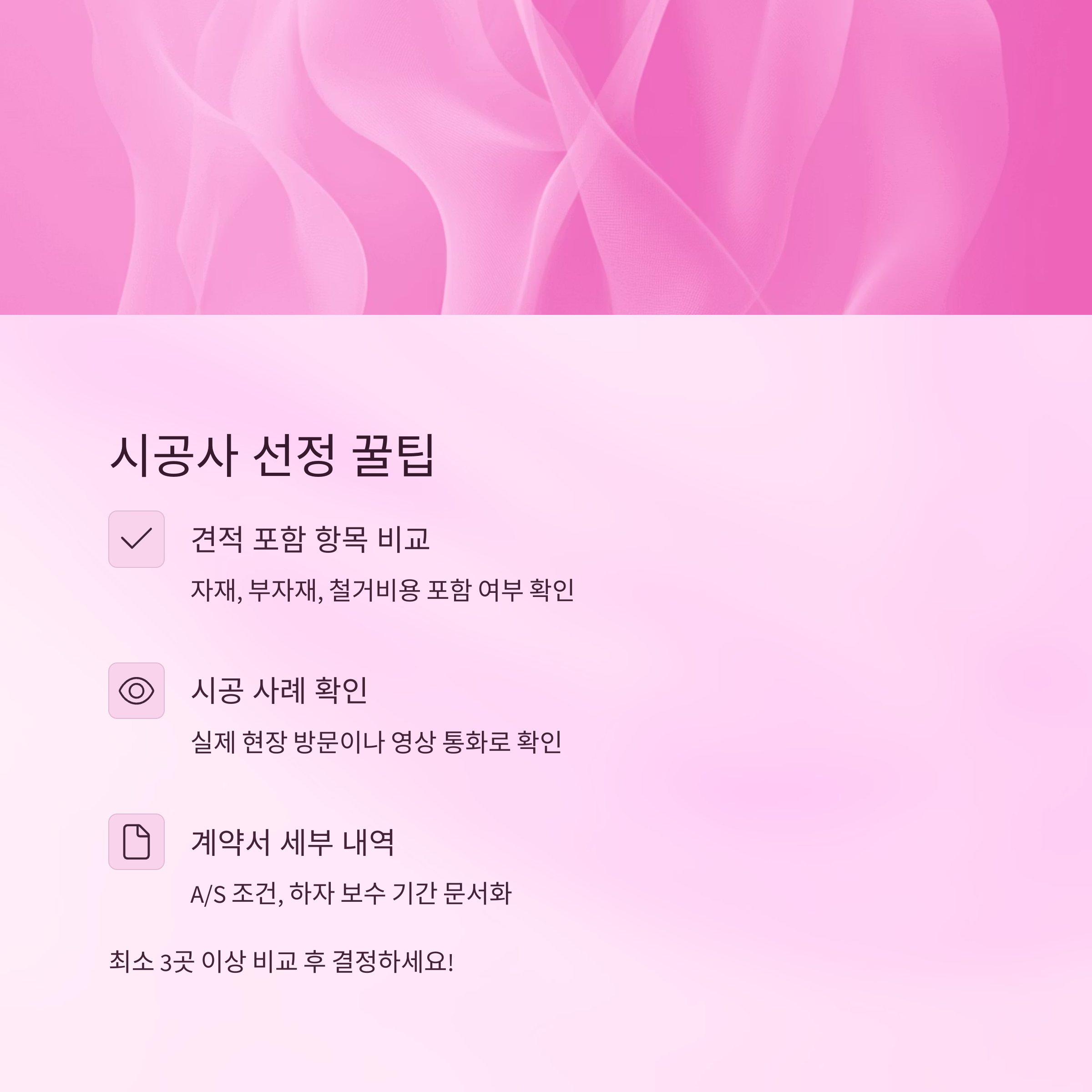 A5. 후기, 포트폴리오, 실물 시공 사례를 꼭 확인하고 3곳 이상 비교 후 계약하는 게 좋아요.