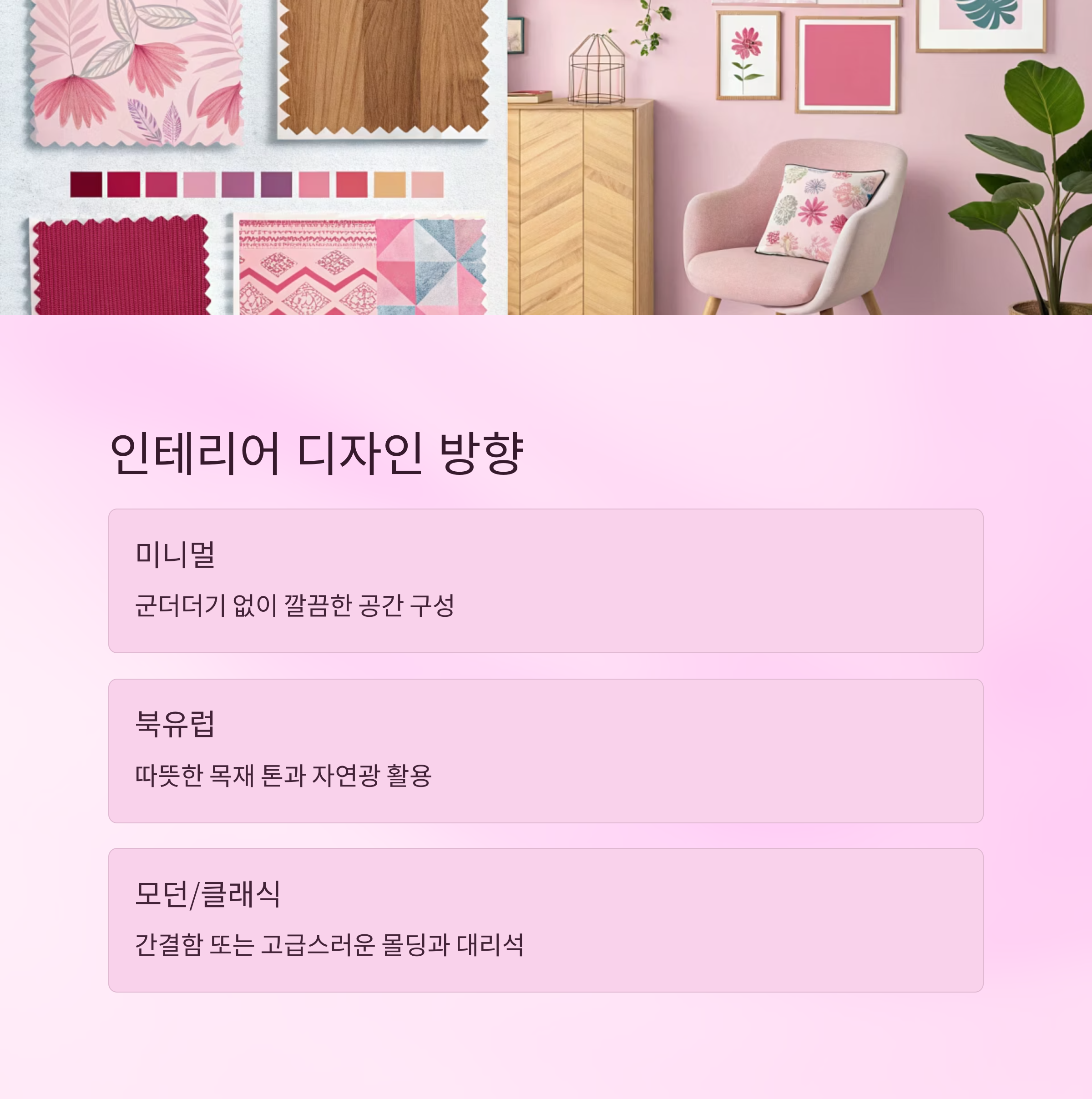 | 북유럽 | 따뜻한 우드톤, 자연광 활용 | 아이방, 주방 |