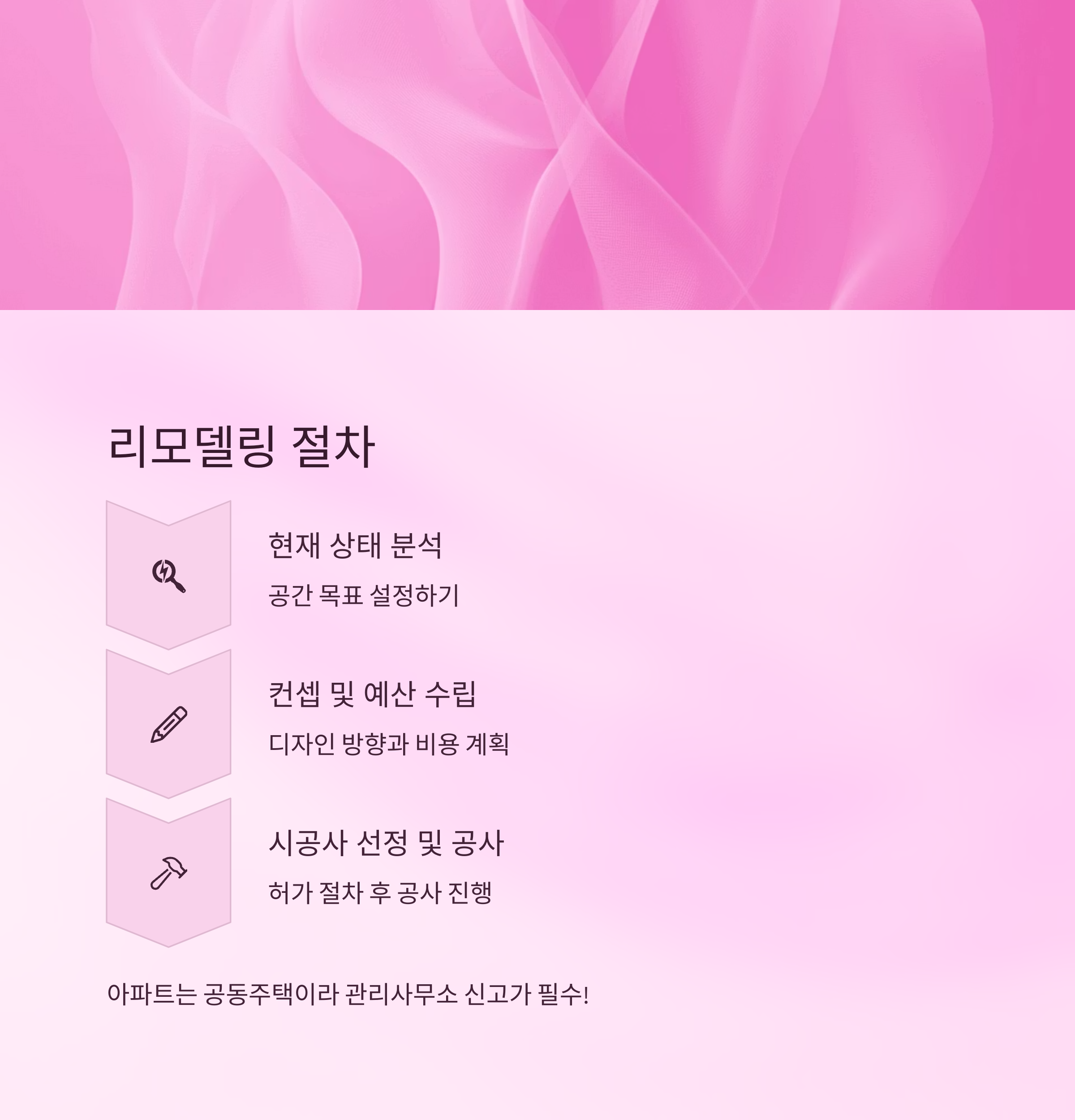 그다음은 실제 진행 절차예요. ① 현재 상태 분석 → ② 리모델링 컨셉 정하기 → ③ 예산 수립 및 견적 받기 → ④ 시공사 및 디자이너 선정 → ⑤ 허가 절차 진행 → ⑥ 공사 진행 → ⑦ 마무리 점검 및 이사 순으로 진행돼요. 각 단계마다 챙겨야 할 게 많기 때문에 처음부터 계획적으로 접근해야 해요.