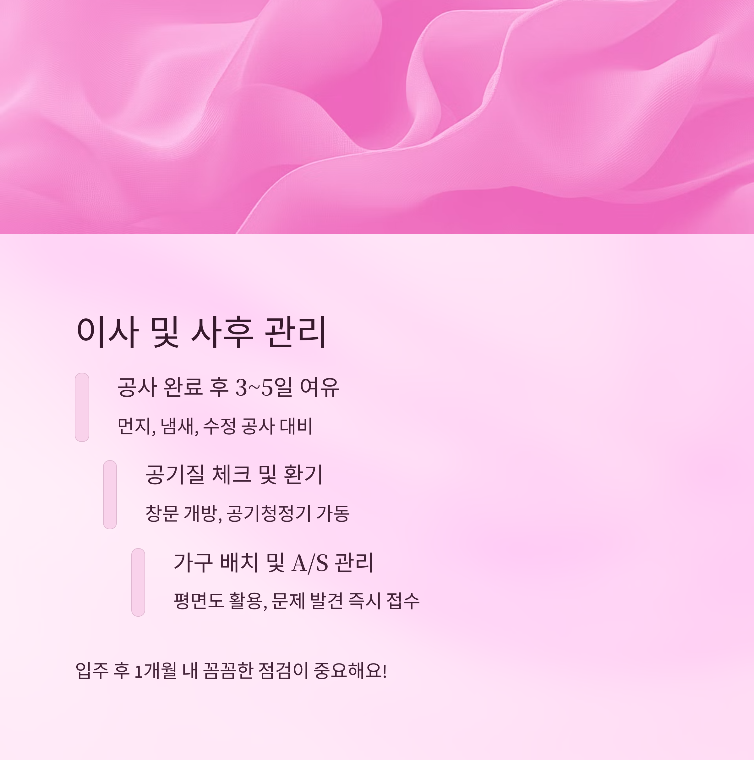 리모델링이 끝났다고 끝이 아니에요! 이제 본격적인 입주 준비가 시작돼요. 가장 먼저 해야 할 일은 이사 날짜를 공사 완료일로부터 최소 3~5일 뒤로 잡는 거예요. 공사 후 잔여 먼지나 냄새, 수정 공사 등 예기치 않은 상황이 생길 수 있으니까요.