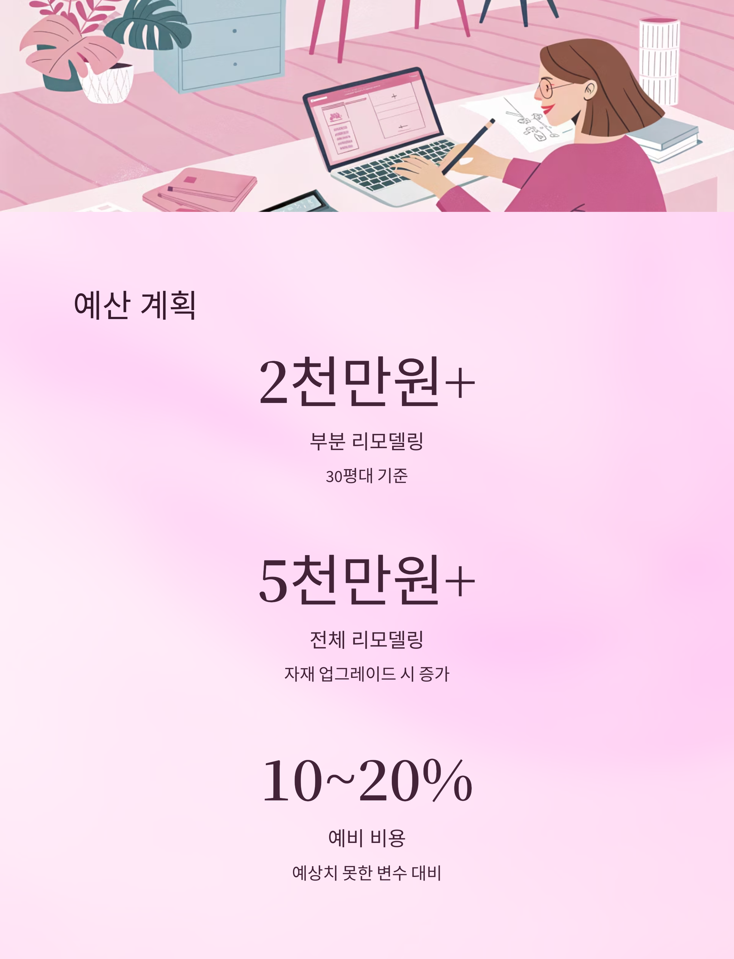 예산은 언제든 바뀔 수 있기 때문에 초기 단계에서 확실한 범위 설정이 중요해요. 가성비를 추구하되, 꼭 필요한 곳엔 아낌없이 투자하는 것이 후회 없는 리모델링의 비결이에요.