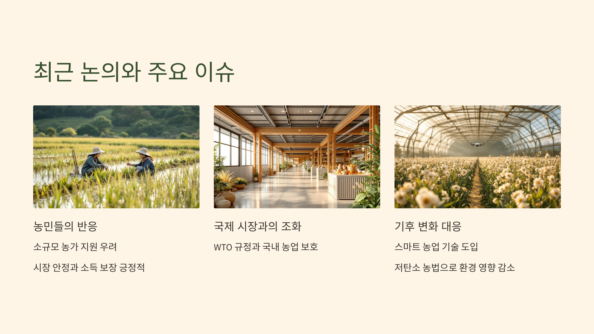 - WTO 규정에 따른 농업 개방 요구에 맞서, 개정안이 국내 농업을 어떻게 보호할지에 대한 논의가 이어지고 있습니다.