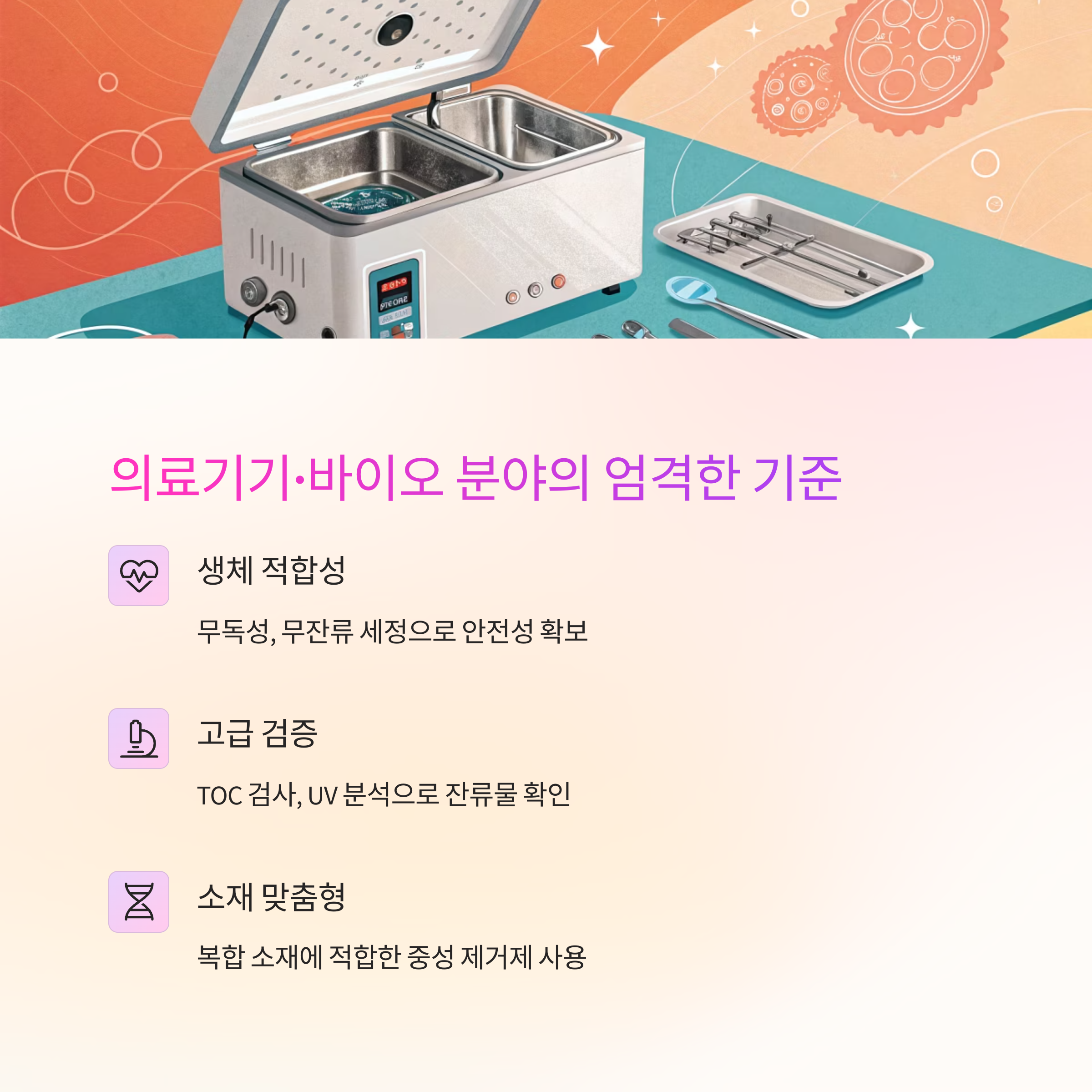 의료기기와 바이오 부품은 사람의 몸과 직접 접촉하거나 체내 삽입되는 제품이 많기 때문에, 청정도 기준이 매우 높아요. 연마 공정이 들어가는 기구는 반드시 생체 적합성과 무균 상태를 유지해야 하기 때문에, 연마제 제거는 단순한 세정 이상의 의미를 가지게 돼요.