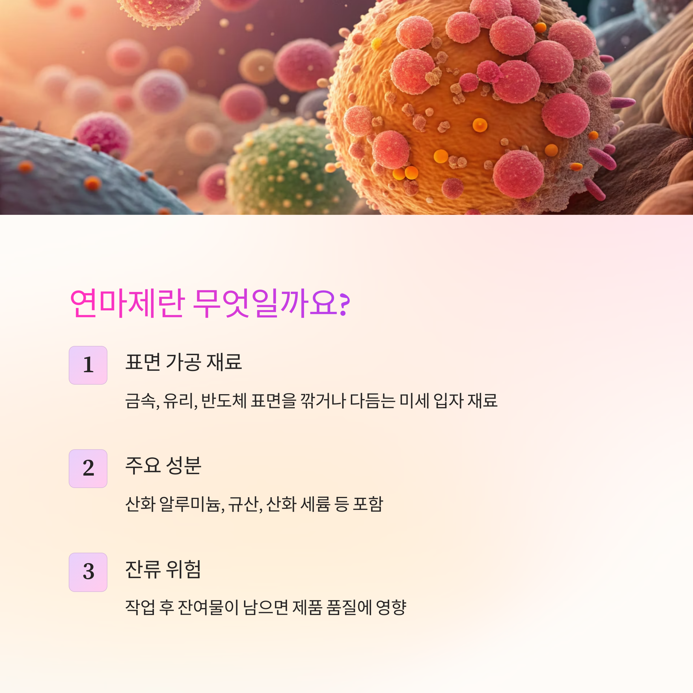 예를 들어 반도체 제조 과정에서 웨이퍼 표면을 평탄화할 때 CMP(Chemical Mechanical Polishing) 공정이라는 걸 사용하는데요, 이때 연마제가 핵심적으로 쓰여요. 하지만 이 과정에서 연마제가 표면에 잔류하면 회로 결함이나 오염 문제를 일으킬 수 있답니다.