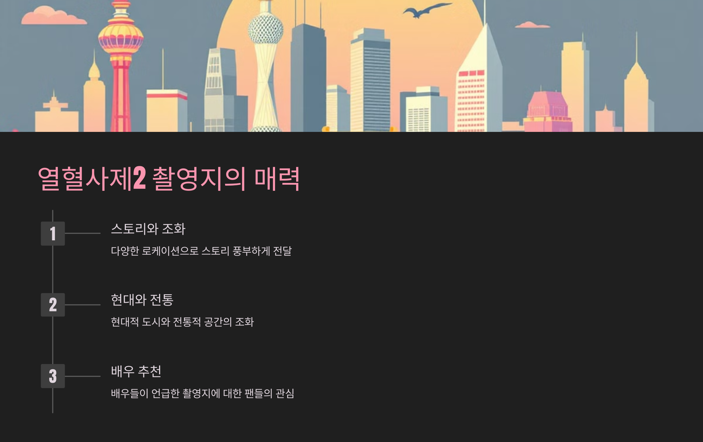 드라마 열혈사제2 촬영지는 팬들에게 새로운 탐방지로 각광받고 있습니다.