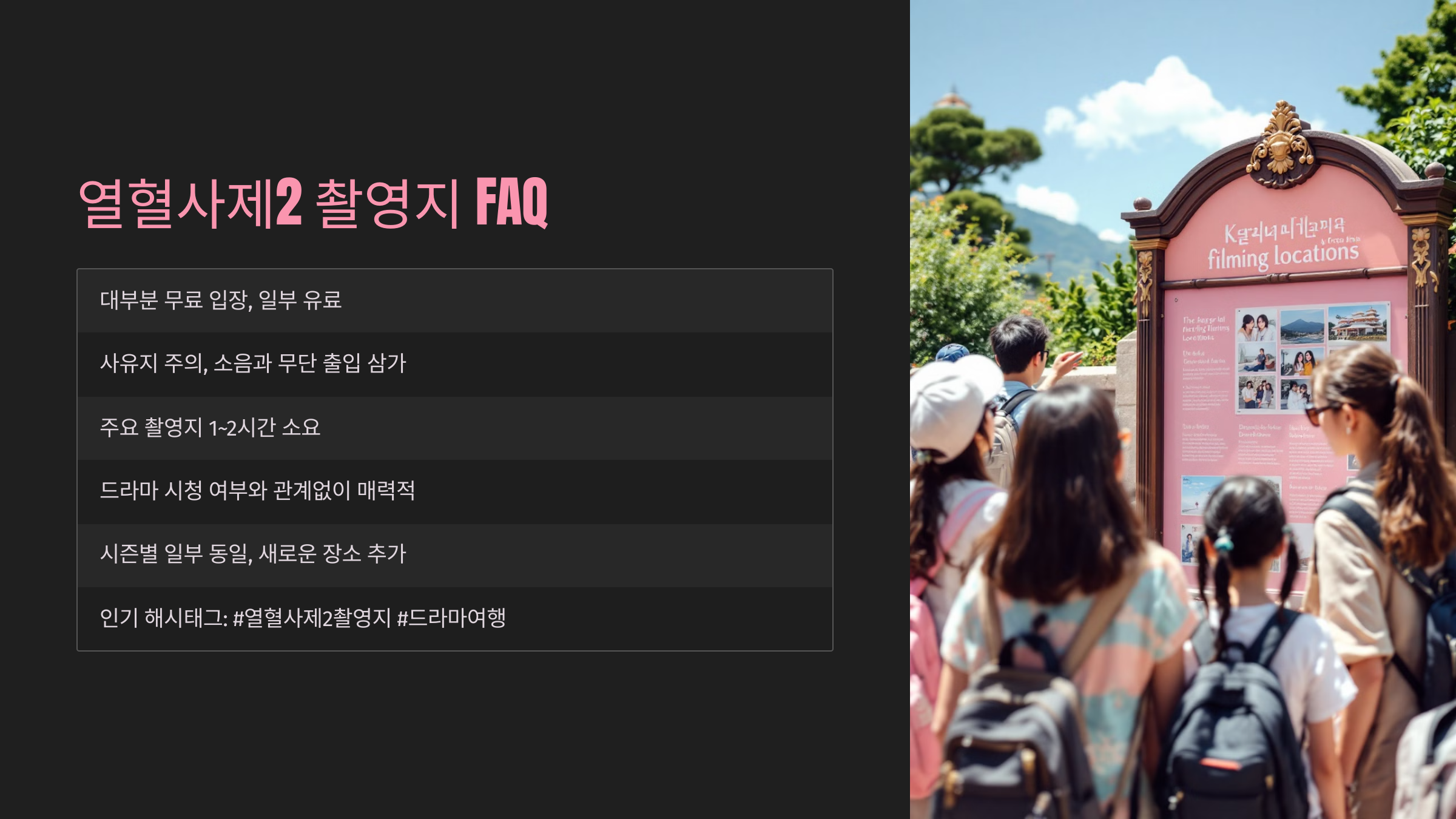 - 운영 시간 및 입장 가능 여부: 일부 촬영지는 개인 사유지일 수 있어 방문 전에 확인이 필수입니다.