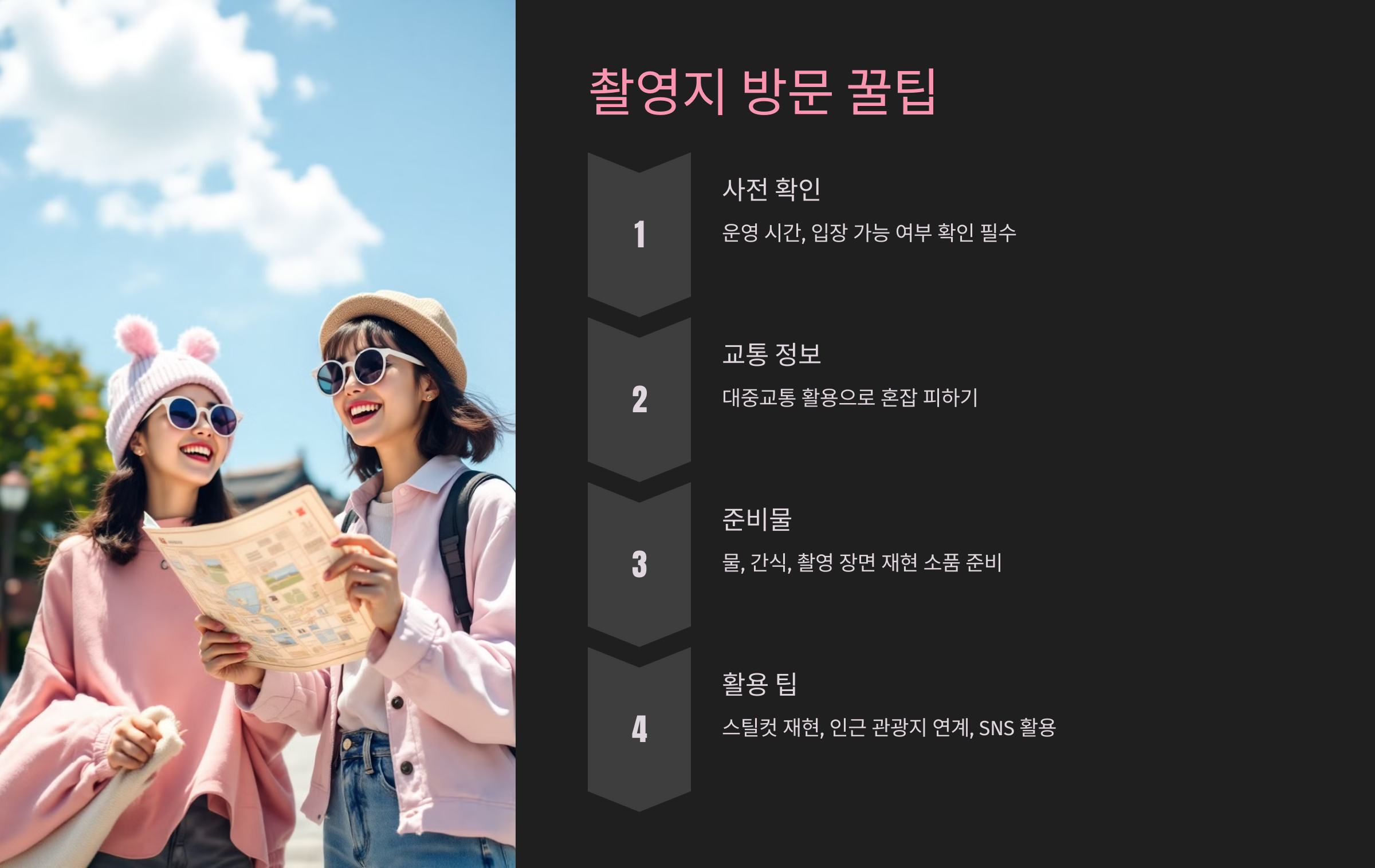 - 교통 정보 확인: 인기 촬영지 근처는 혼잡할 가능성이 있으므로 대중교통을 적극 활용하세요.