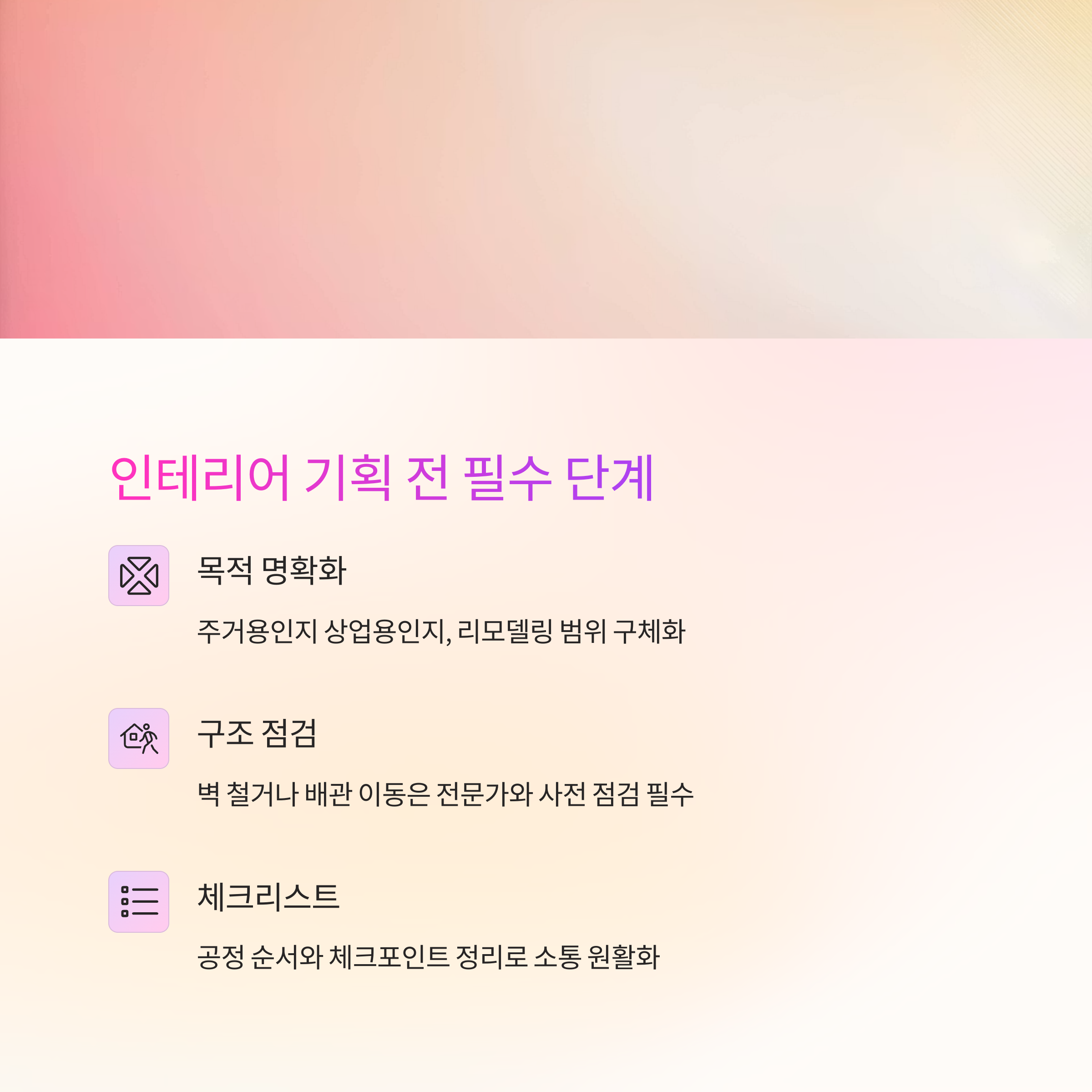 마지막으로, 반드시 체크리스트를 작성하세요. 전체 공정 순서와 체크포인트를 정리해두면 업체와 소통할 때도 정확하고, 견적 비교 시 기준이 생겨서 훨씬 유리해요.