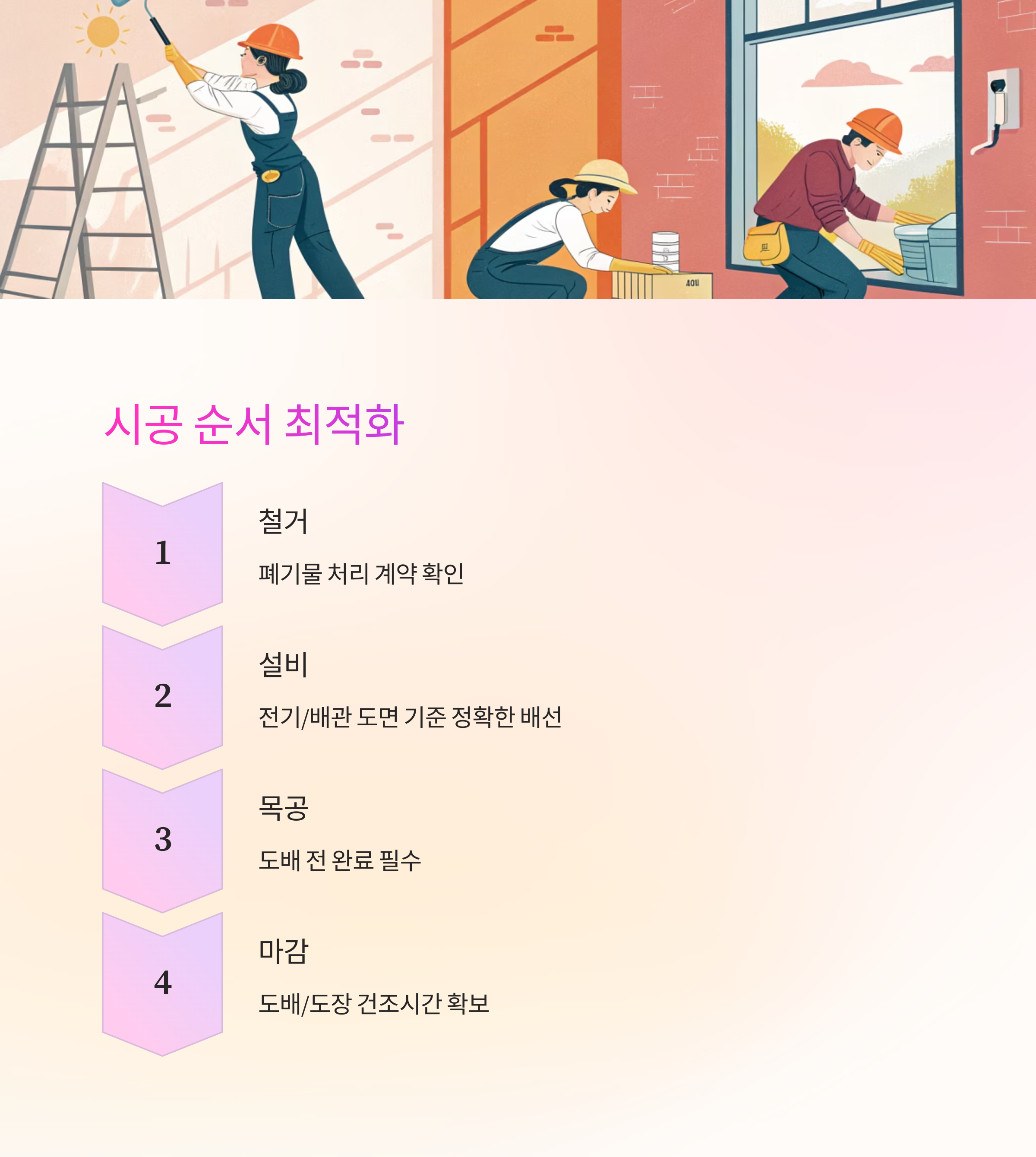 | 공정 순서 | 철거 → 설비 → 마감 순 정리 | ★★★★★ |