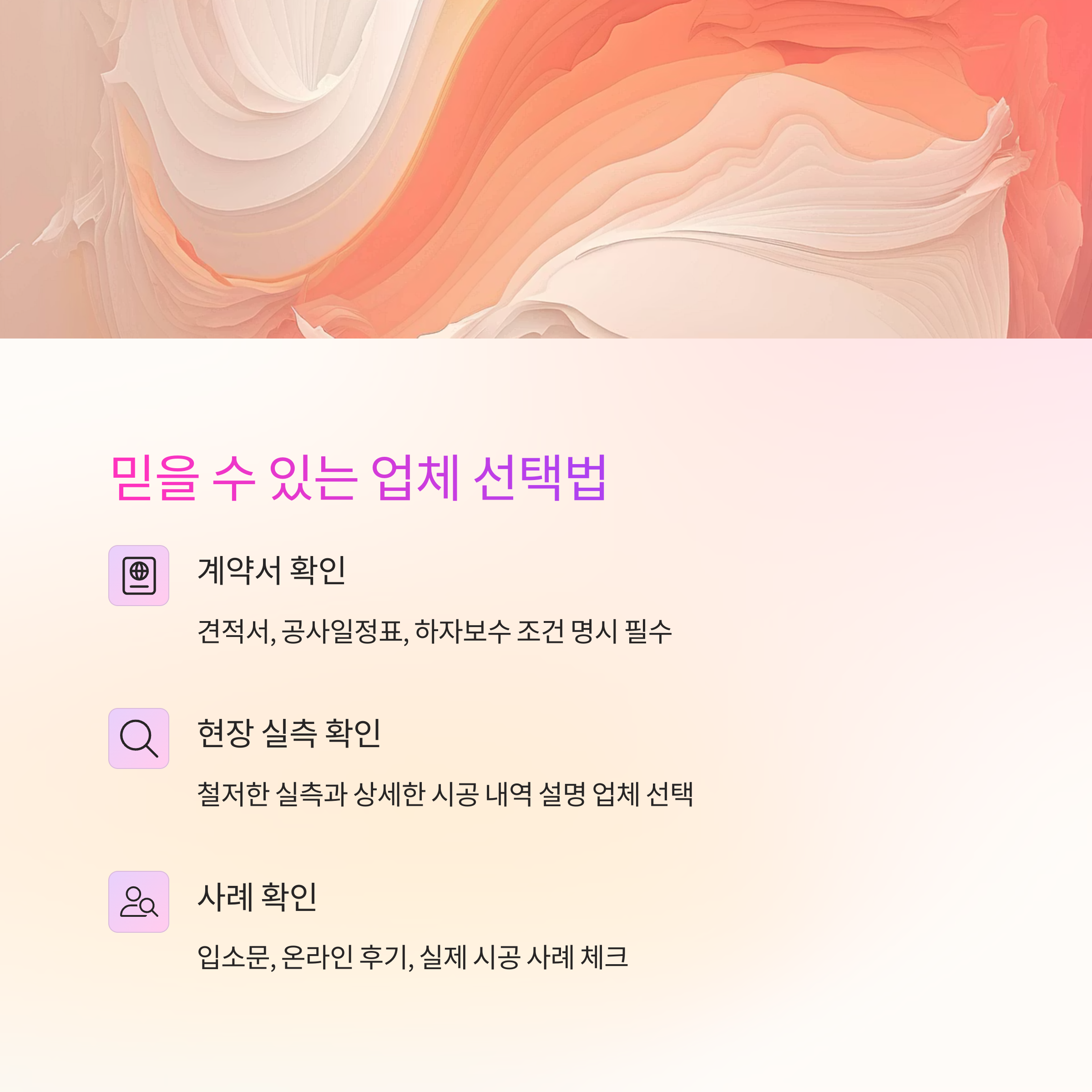 업체 선정 시 체크포인트는 다음과 같아요. 첫째, 현장 실측을 철저히 하는가. 둘째, 시공 내역을 상세하게 설명하는가. 셋째, 하자 보수 기간을 명확히 안내하는가. 넷째, 무등록 업체는 아닌가. 이런 점만 잘 체크해도 큰 문제를 예방할 수 있어요.