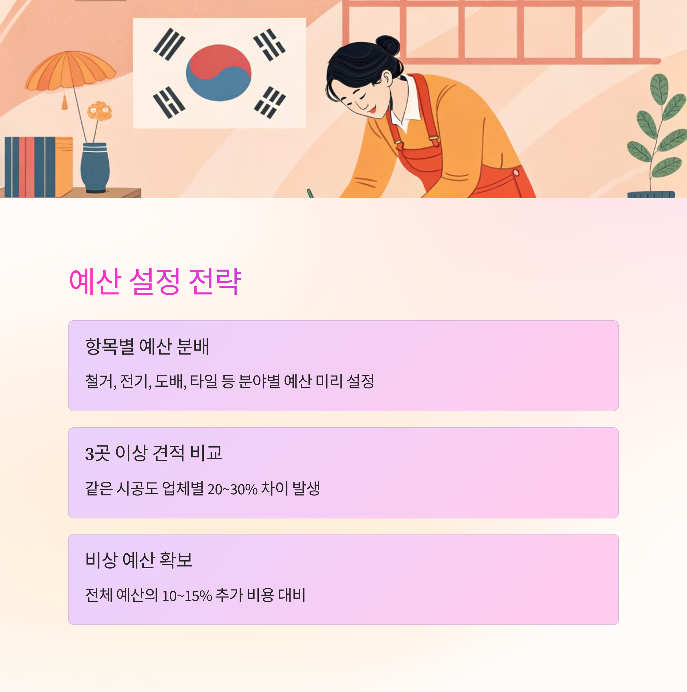 가장 흔한 실수가 추가 비용을 고려하지 않은 채 예산을 짜는 거예요. 공사 도중에는 예상치 못한 문제가 발생할 수 있고, 그때마다 추가 비용이 붙어요. 전체 예산의 10~15% 정도는 ‘비상 예산’으로 따로 떼어두는 게 좋아요.
