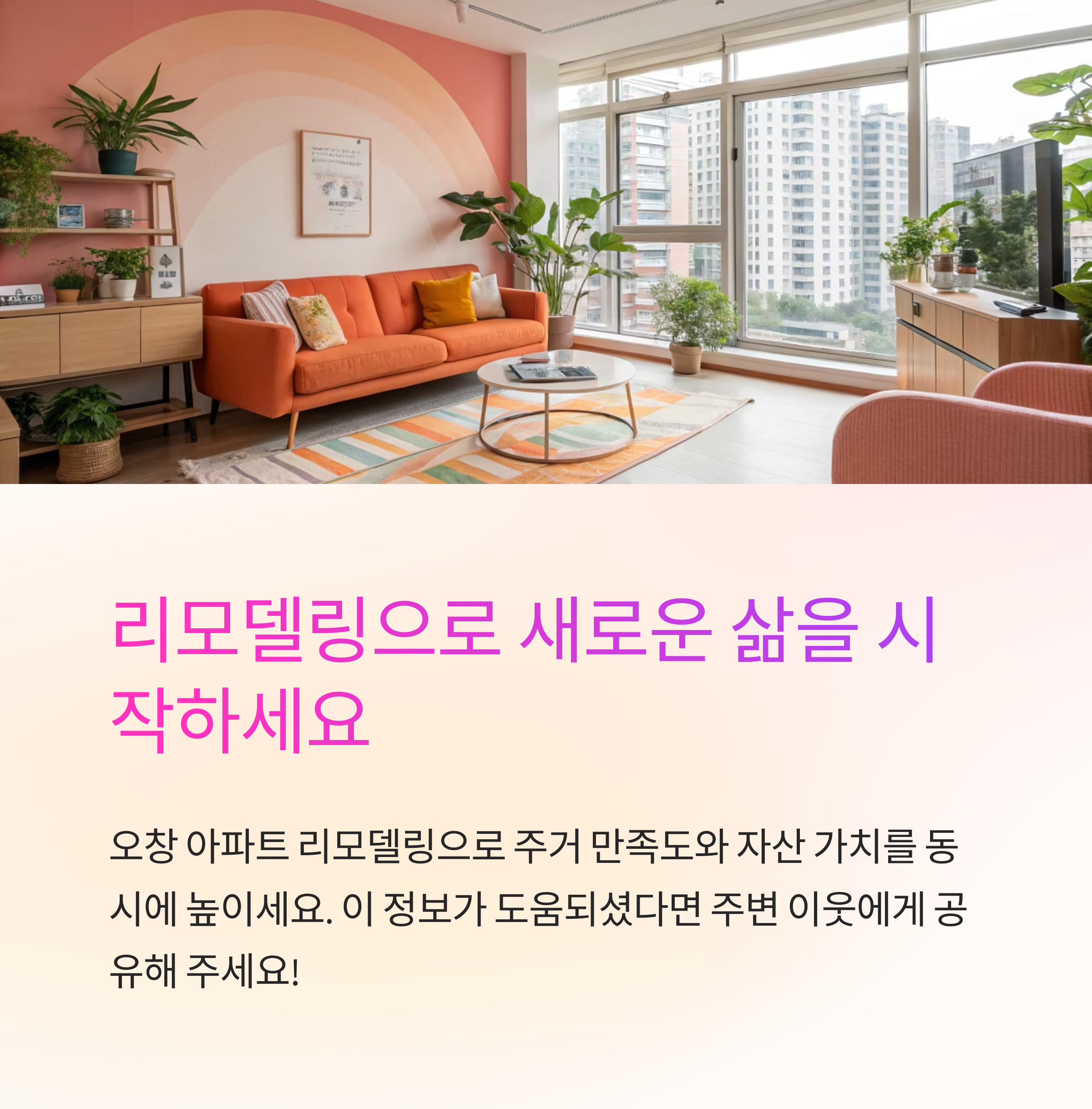 오창처럼 학군·교통·생활 인프라가 안정적인 지역일수록 리모델링은 단순한 생활 편의 이상의 자산 가치 상승 수단이 되는 것 같아요! 🛠️