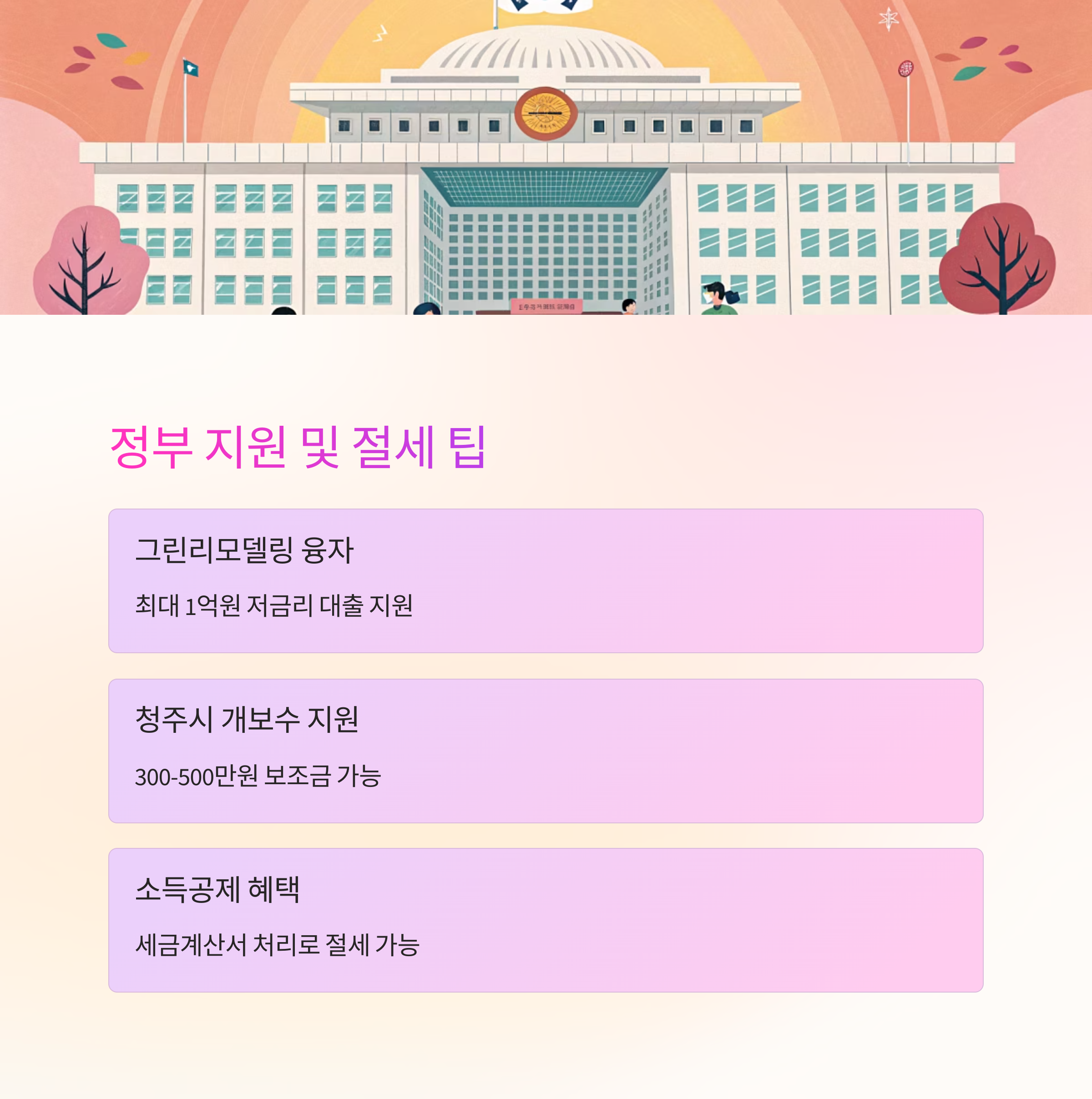 | 청주시 개보수 지원 | 300만~500만 원 보조 | 주민센터 통해 신청 |