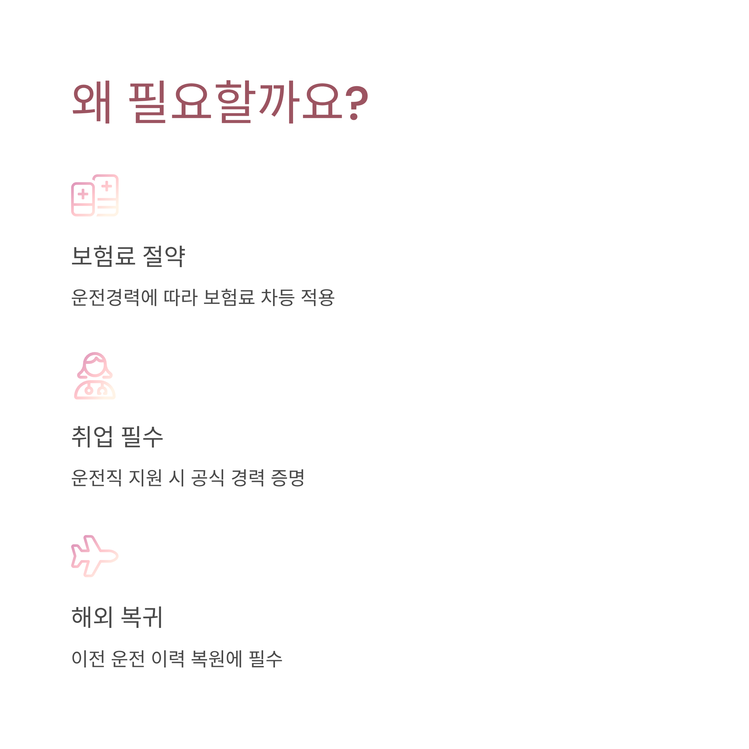 또한 운전 경력이 필요한 직종에 지원할 때는 이 서류가 공식적인 경력 증명이 돼요. 운전이 주요 업무가 아닌 경우에도, 회사에서 안전운전을 신뢰할 수 있는 기준이 되기 때문에 요구하는 경우가 많아요.
