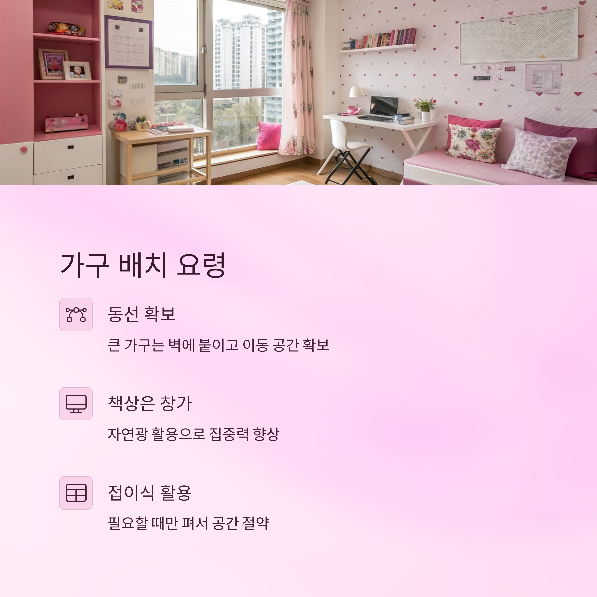 | 책상 | 창가 옆 | 자연광 활용, 집중력 향상 |