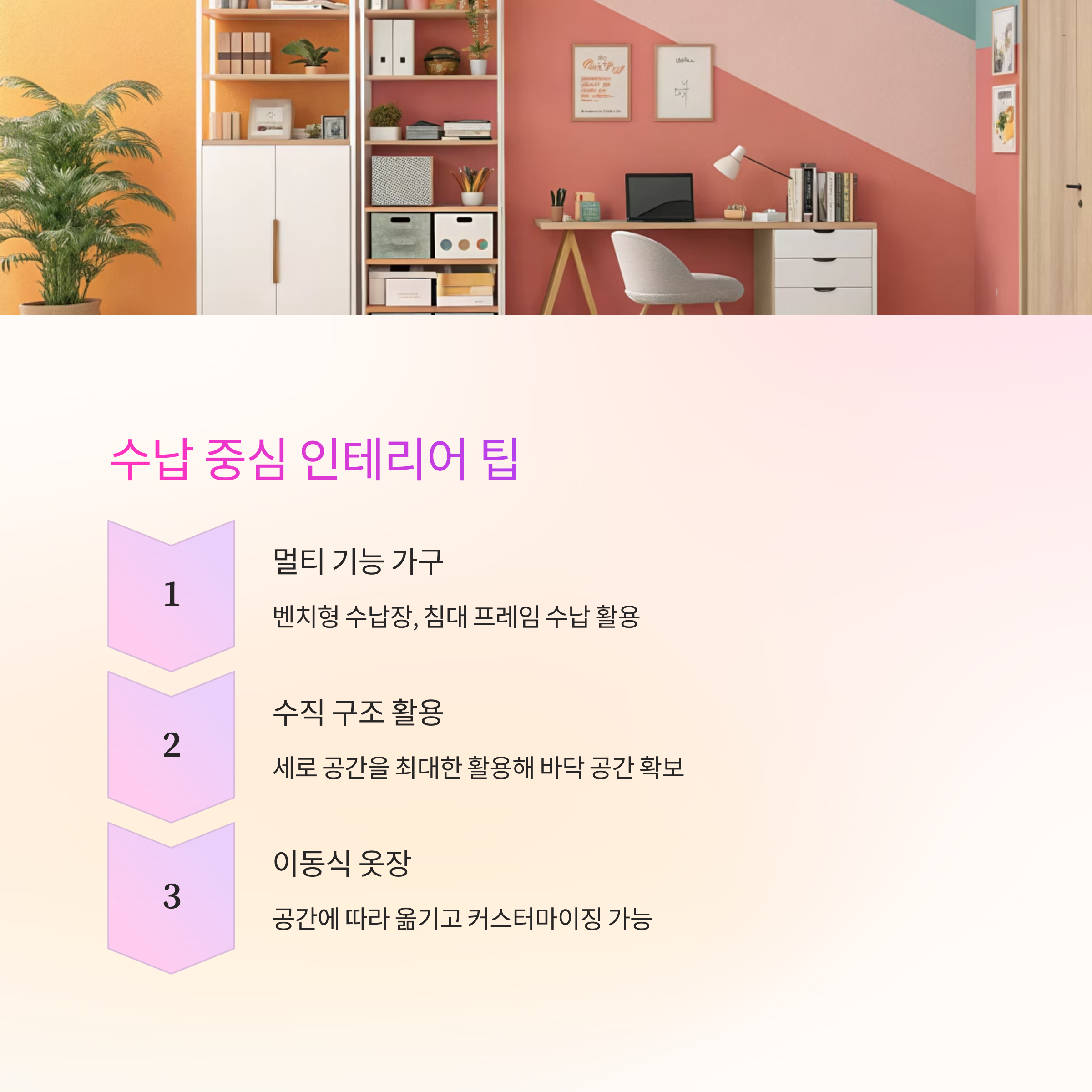 예를 들어, 벤치형 수납장이나 침대 프레임 안 수납 공간, 거울과 수납장이 결합된 제품이 좋아요. 수납 가구는 바닥을 차지하는 만큼, 수평보다는 수직 구조를 활용해 공간을 세로로 확장하는 게 포인트랍니다.