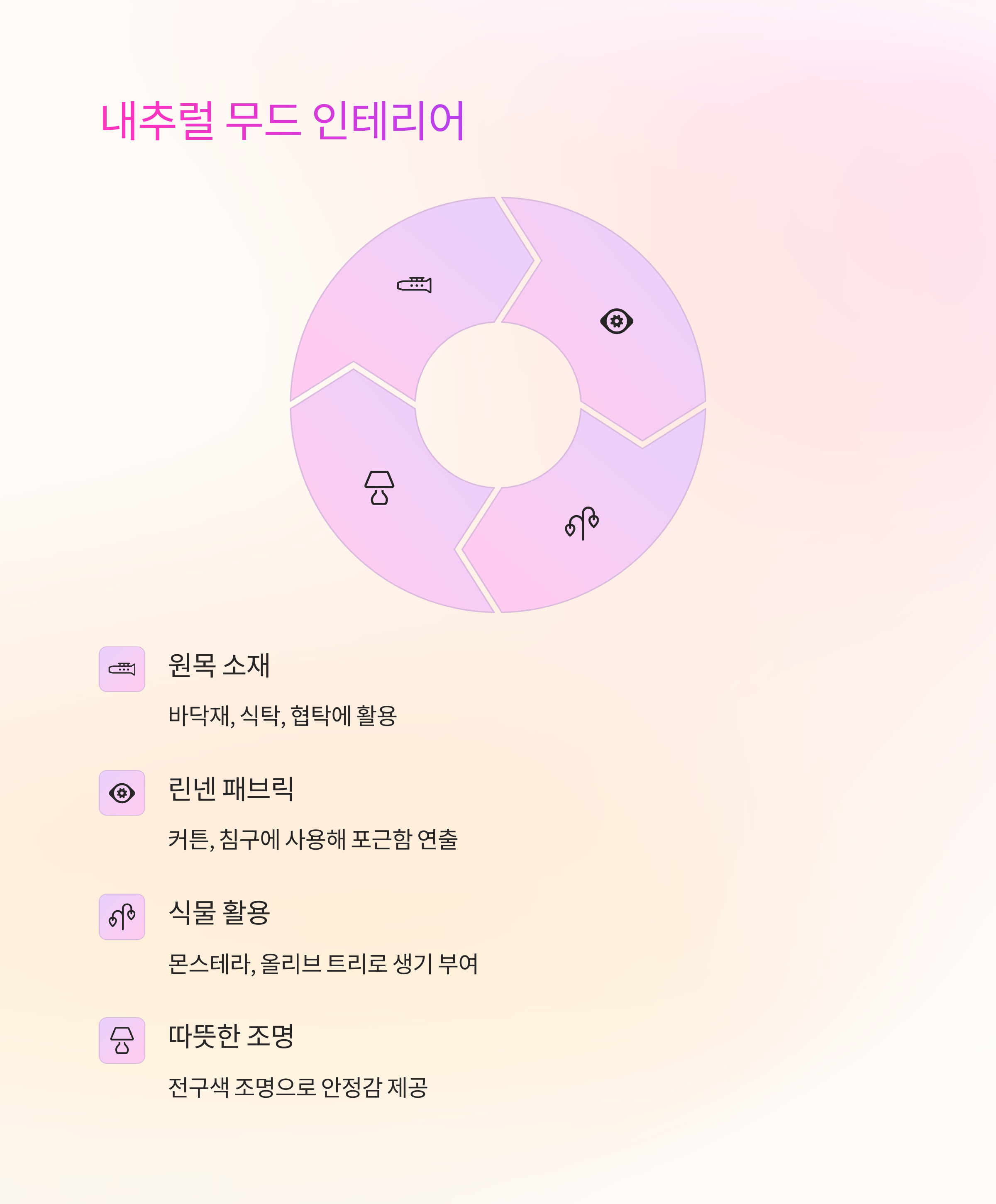자연의 따뜻함을 담은 내추럴 인테리어는 율량동처럼 고요하고 여유 있는 지역에서 더욱 잘 어울려요. 내추럴 무드는 목재 소재, 린넨 패브릭, 식물을 활용한 편안한 분위기를 중심으로 구성돼요.