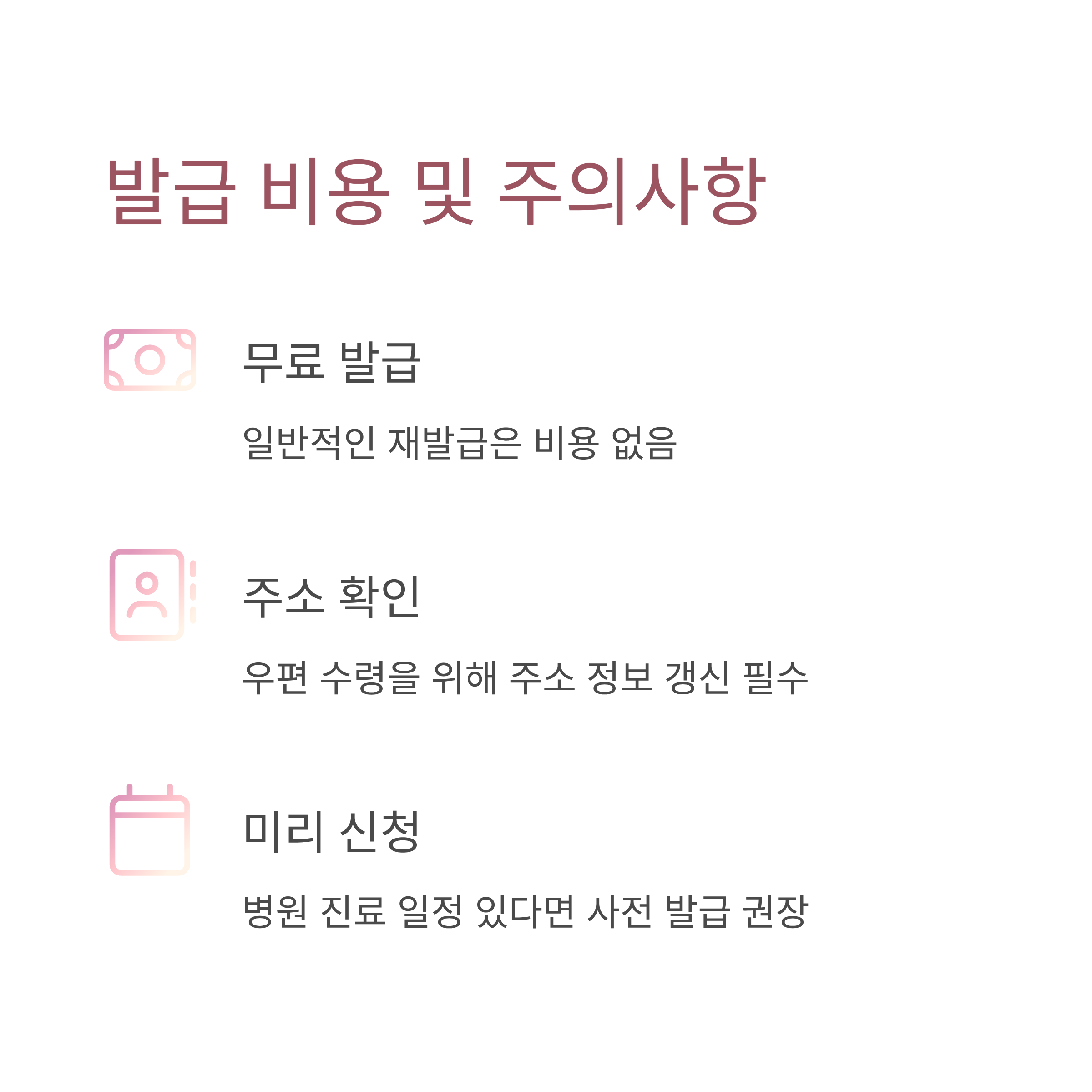 신청 시 개인정보가 정확해야 발급이 지연되지 않아요. 주소가 바뀌었는데 갱신하지 않았다면 우편이 반송될 수 있으니 꼭 확인해 두는 게 좋아요. 병원 진료 일정이 있다면 미리 발급 신청을 하는 것이 안전해요.