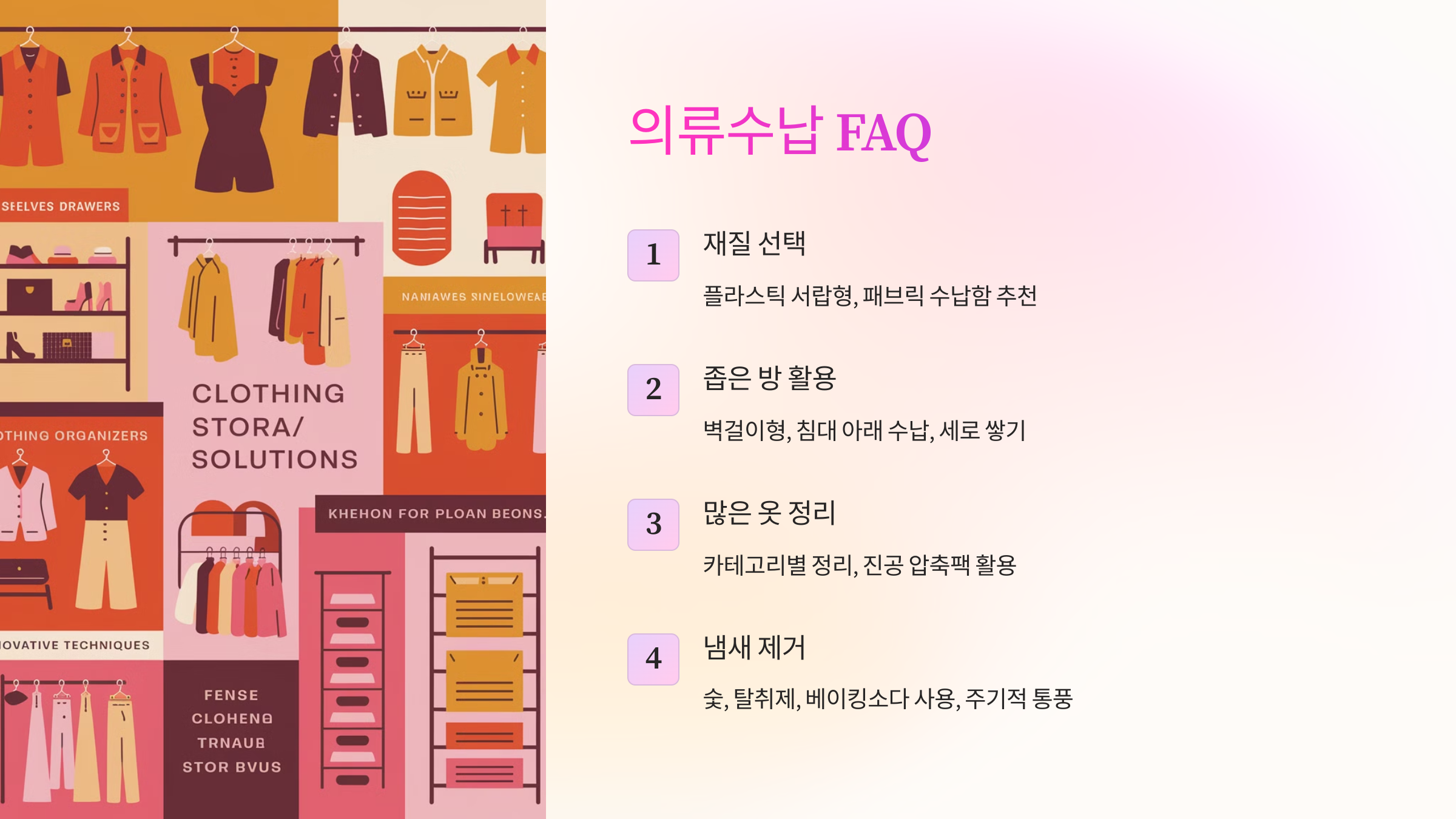 A4. 여름 옷은 **제습제**와 함께 보관하고, 겨울 옷은 **옷걸이에 걸거나 진공 압축팩**을 사용하면 좋아요. 니트류는 접어서 보관해야 늘어나지 않아요! 👕