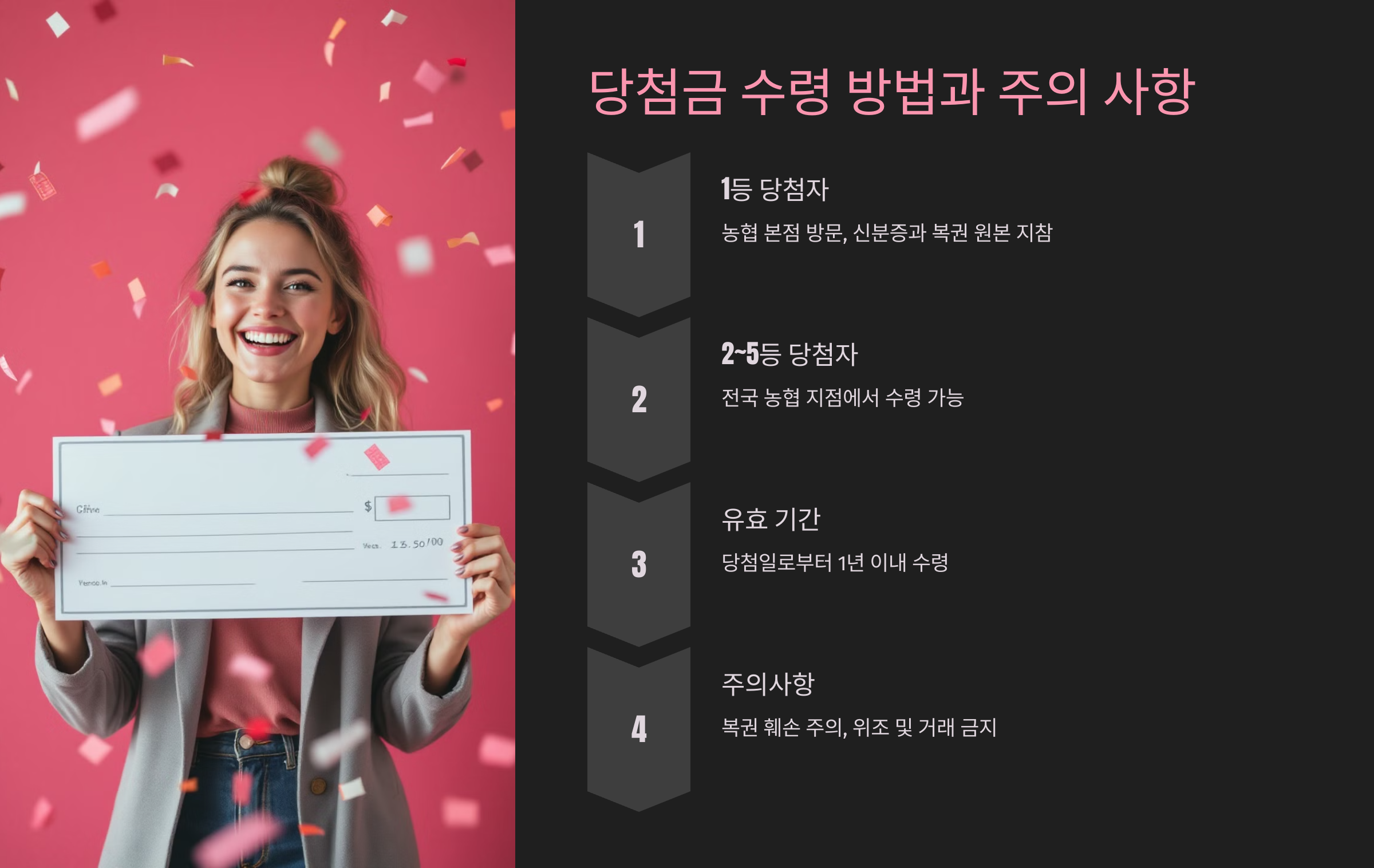 - 유효 기간: 당첨일로부터 1년 이내에 수령해야 하며, 기한이 지나면 당첨금이 무효 처리됩니다.