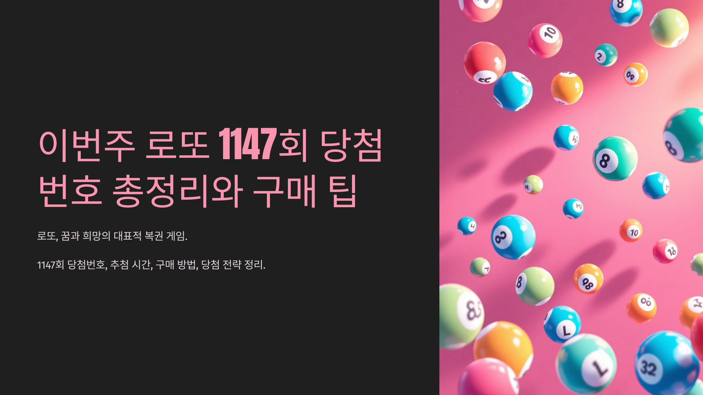 로또는 꾸준히 많은 사람들에게 꿈과 희망을 안겨주는 대표적인 복권 게임입니다. 매주 토요일, 추첨 시간이 다가올수록 설레는 마음으로 당첨번호를 기다리는 사람들은 한둘이 아닙니다. 이번 1147회 로또 당첨번호, 추첨 시간, 구매 방법 및 당첨 전략을 체계적으로 정리해보았습니다. 이 글은 로또에 관심 있는 분들에게 꼭 필요한 정보를 담고 있으며, 다음 회차를 준비하는 데 실질적인 도움을 줄 수 있도록 구성되었습니다.