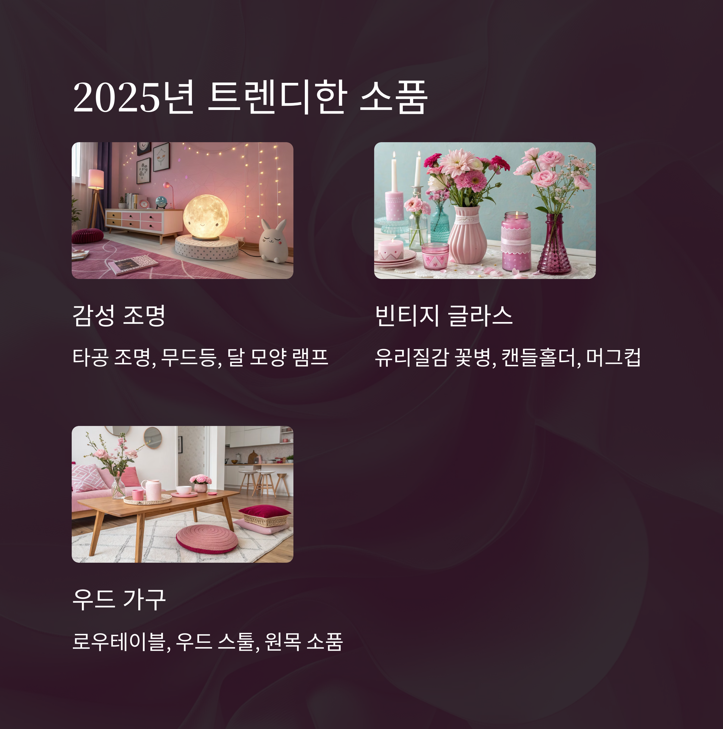 | 빈티지 로맨틱 | 로즈핑크, 딥그린 | 앤틱 프레임, 촛대 조명 | 감성적이고 클래식한 분위기 |