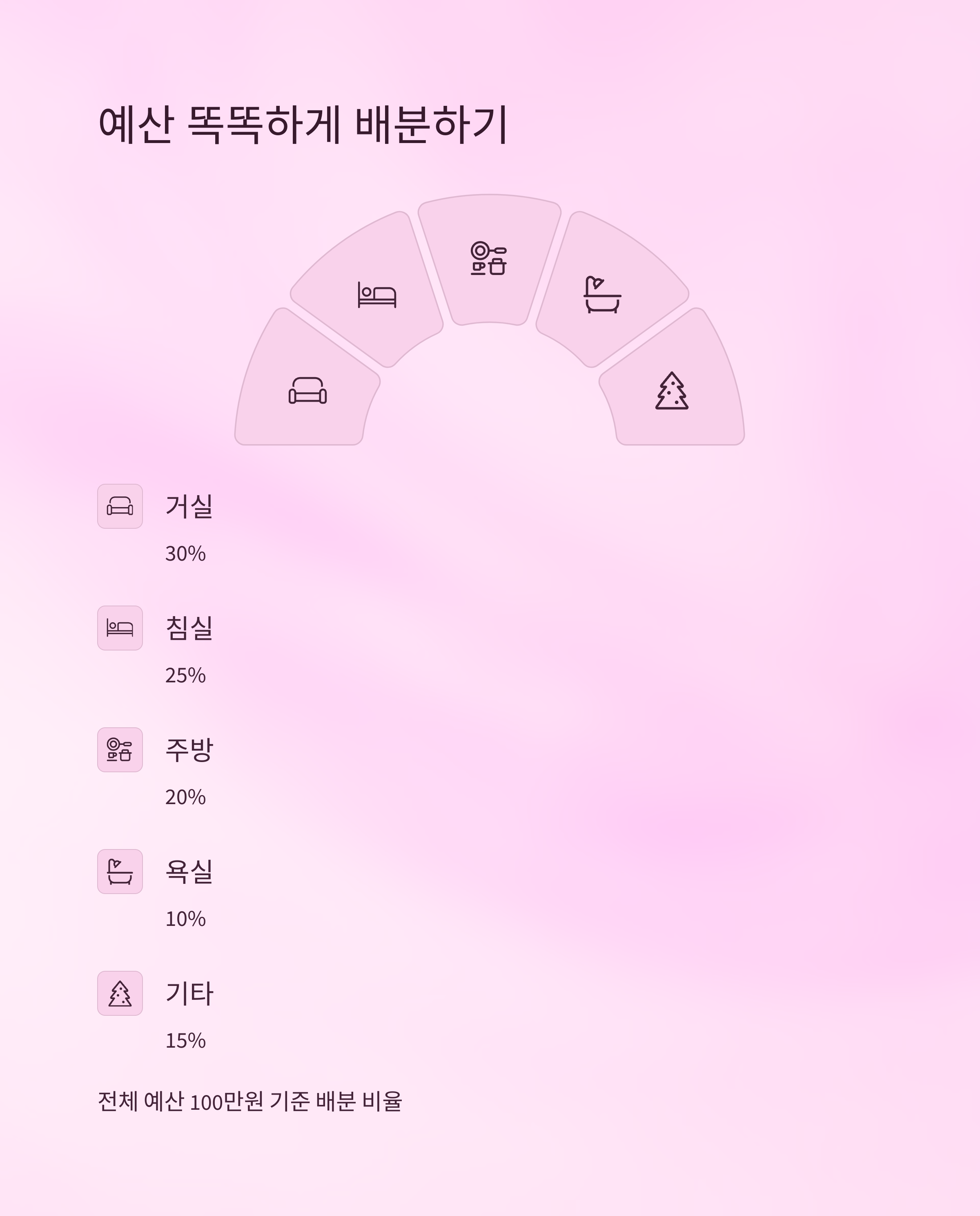 신혼집 소품은 소소한 비용처럼 보이지만, 모이다 보면 생각보다 큰 지출이 될 수 있어요. 그래서 미리 예산을 세워 항목별로 배분해두는 게 좋아요. 전체 소품 예산을 100만 원이라면, 거실 30%, 침실 25%, 주방 20%, 욕실 10%, 기타 15% 정도로 나누는 게 실용적이에요.