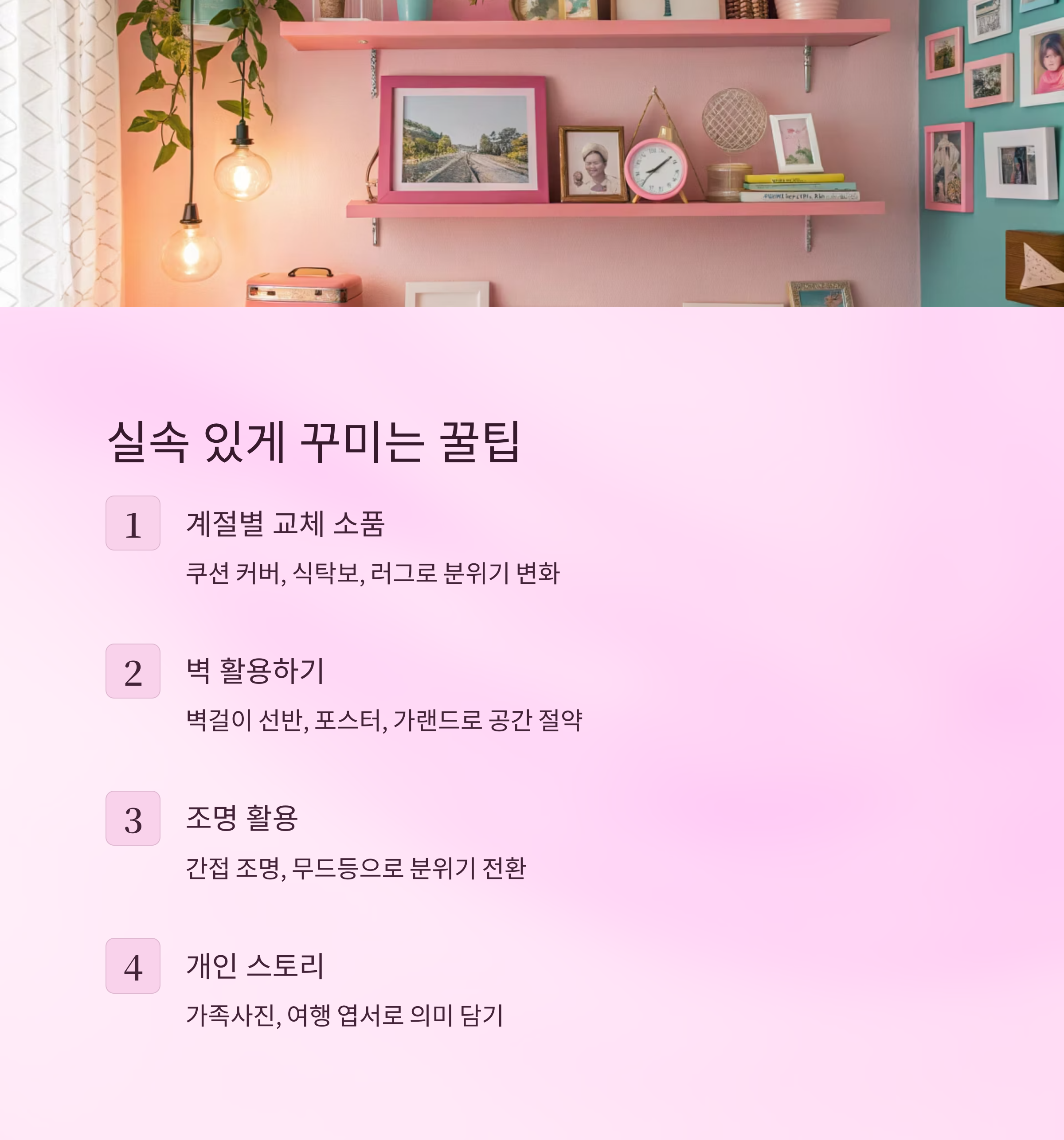 넷째, 가족사진이나 여행지 엽서를 액자에 넣는 식으로 ‘우리만의 이야기’를 담는 인테리어가 감성 포인트예요. 같은 소품이라도 나만의 의미를 담으면 훨씬 특별하니까요 😊