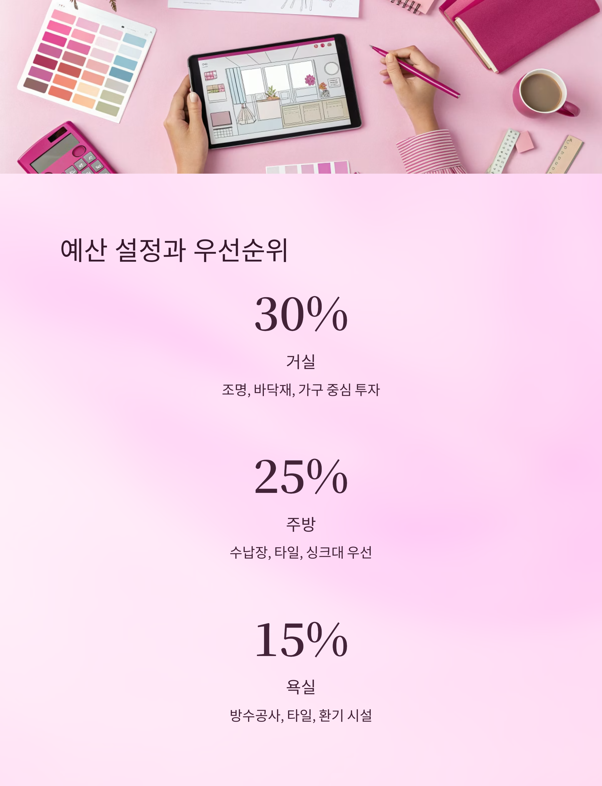 | 거실 | 30% | 조명, 바닥재, 가구 |