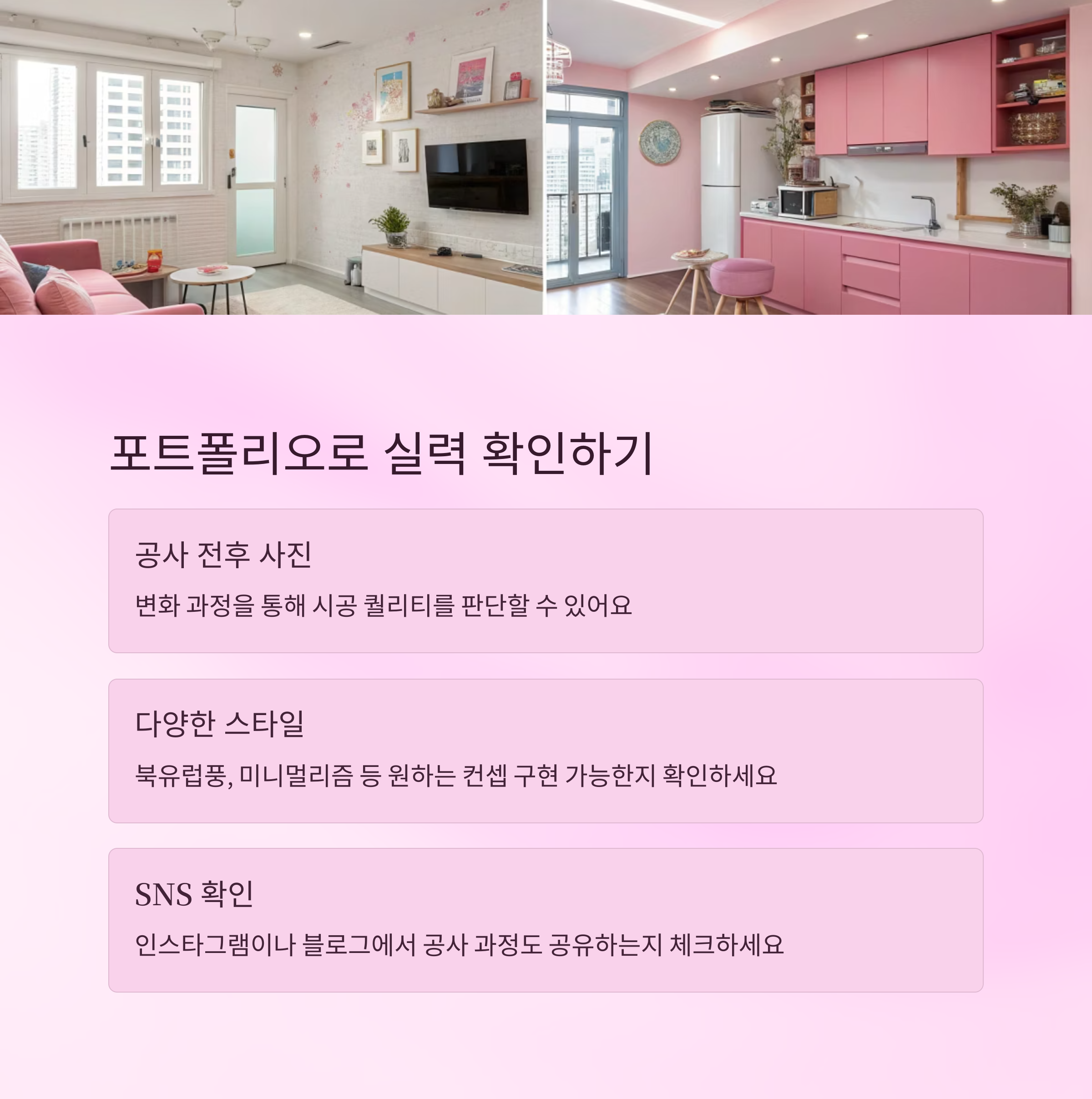 요즘은 인스타그램이나 블로그로 포트폴리오를 많이 공유하니, 해당 채널도 꼭 확인해보세요. 비포 애프터뿐 아니라 공사 중 과정도 공유하는 업체는 믿음이 더 가요.