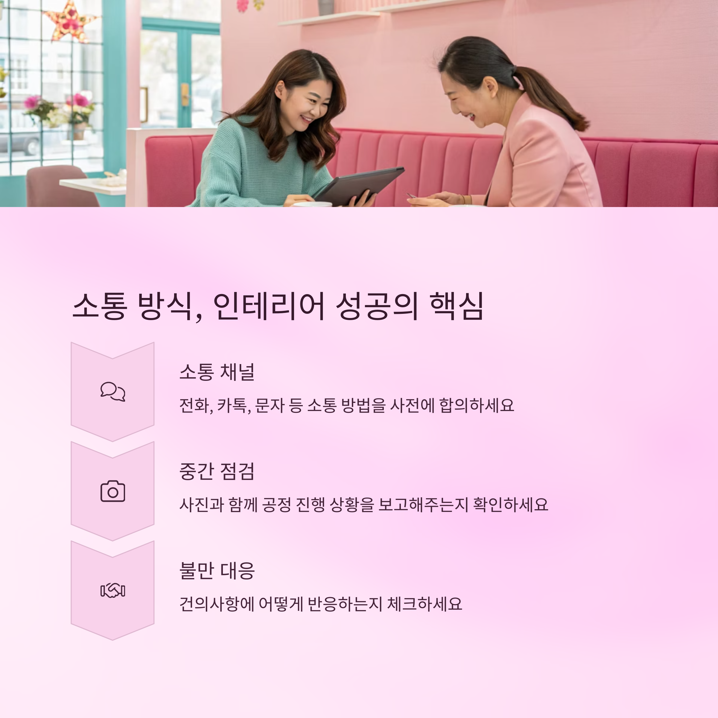 인테리어는 짧게는 2주, 길게는 몇 달 동안 진행되는 프로젝트예요. 그만큼 소통 방식이 매우 중요하답니다. 담당자와의 커뮤니케이션이 원활하지 않으면 스트레스만 쌓일 수 있어요.