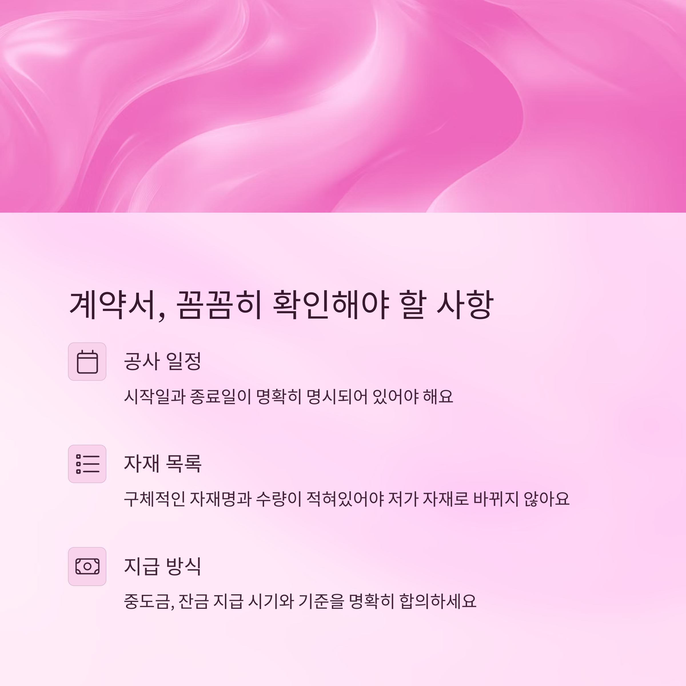 계약서에는 공사 시작일과 종료일, 전체 공사 금액, 공정별 단가, 하자보수 조건 등이 명시돼야 해요. 또한 자재 목록도 구체적으로 적혀 있어야 나중에 저가 자재로 바뀌는 일을 막을 수 있어요.