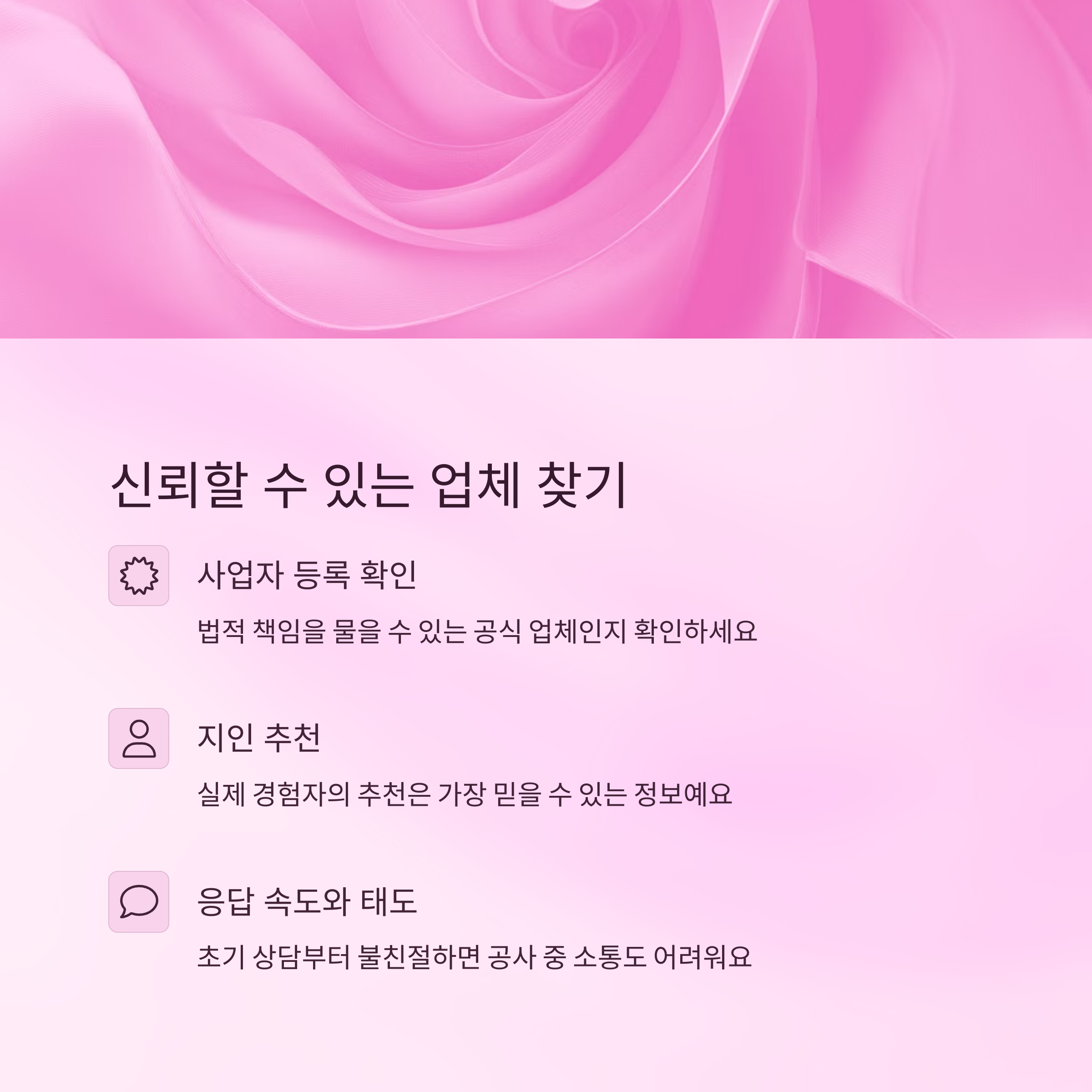 전화나 이메일 문의를 했을 때 응답 속도와 태도도 중요한 기준이 될 수 있어요. 초반부터 불친절하거나 응답이 느리다면 공사 과정 중에도 소통이 어려울 가능성이 크답니다.