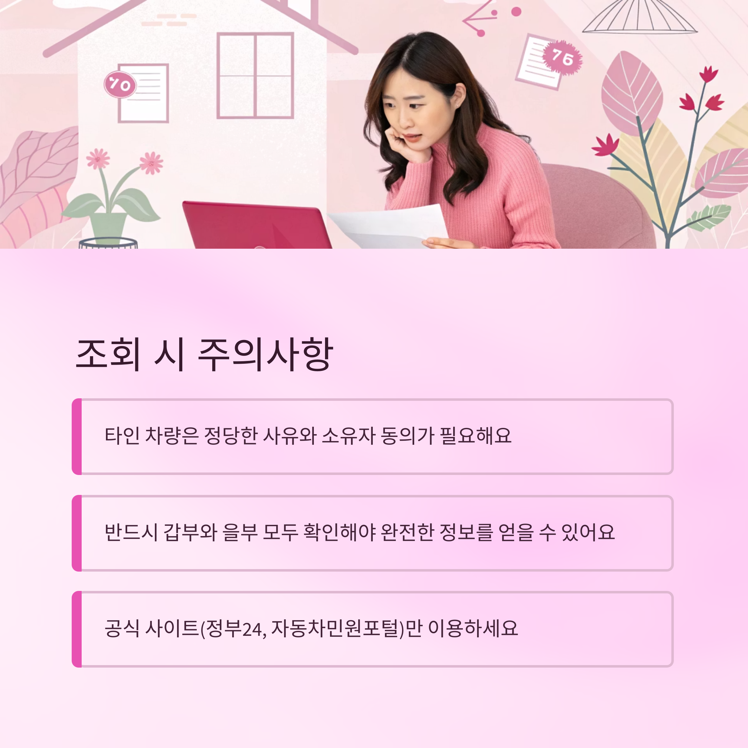 인터넷에서 유사 사이트를 통해 조회할 수 있다고 광고하는 경우도 있는데, 공식사이트 외에는 개인정보 유출 위험이 커요. 꼭 정부24나 자동차민원포털 같은 공공기관 홈페이지만 이용해야 해요.
