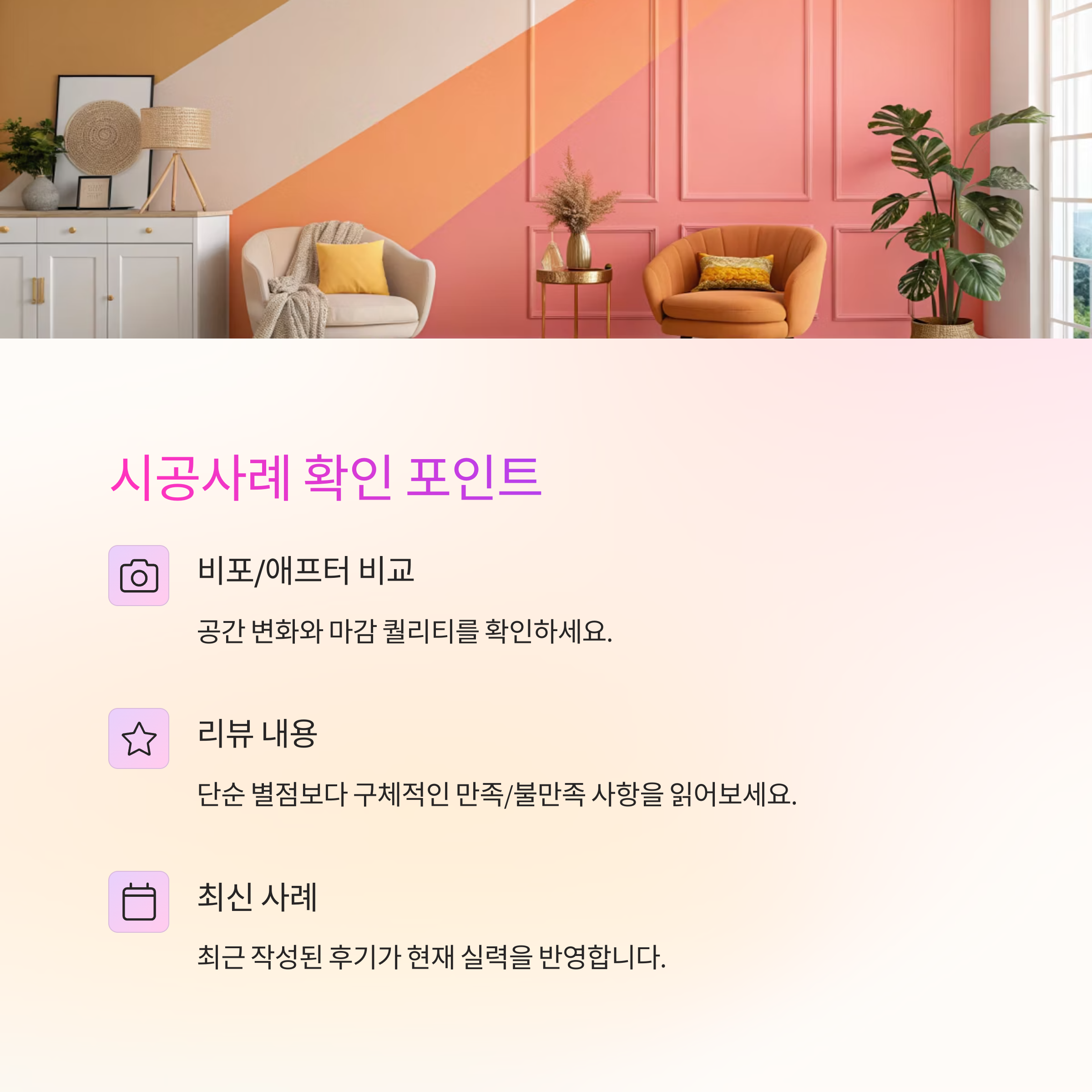 후기나 시공사례를 캡처해 두고, 내가 원하는 스타일과 가까운 업체를 중심으로 좁혀 나가면, 결정도 쉬워지고 만족도도 높아질 거예요!