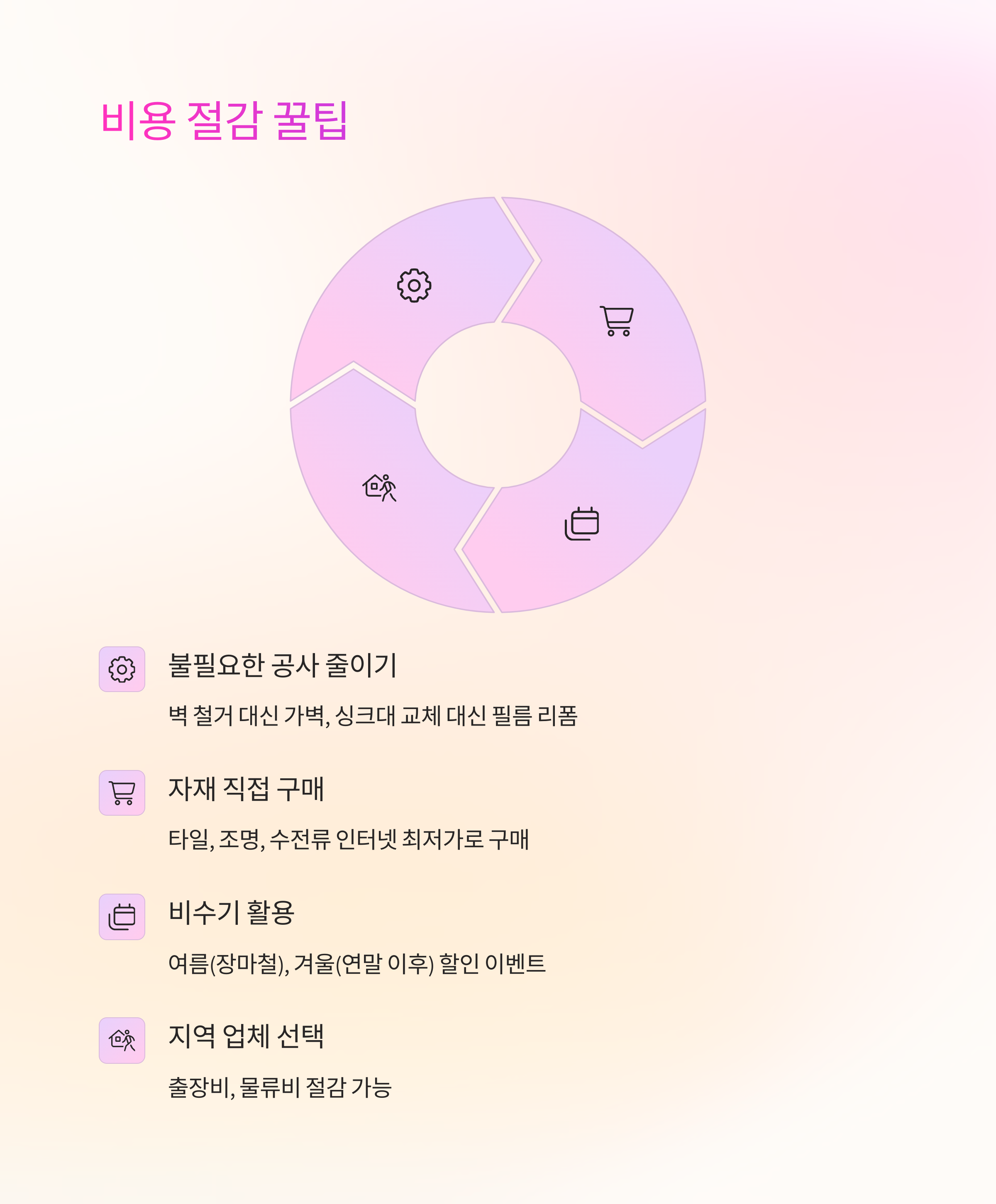 세 번째는 계절별 프로모션을 활용하는 거예요. 인테리어 비수기인 여름(장마철)이나 겨울(연말 이후)에는 업체들도 수요가 줄어 할인 이벤트를 많이 해요. 이 시기를 노리면 동일한 시공이라도 최대 20~30% 저렴하게 할 수 있어요.