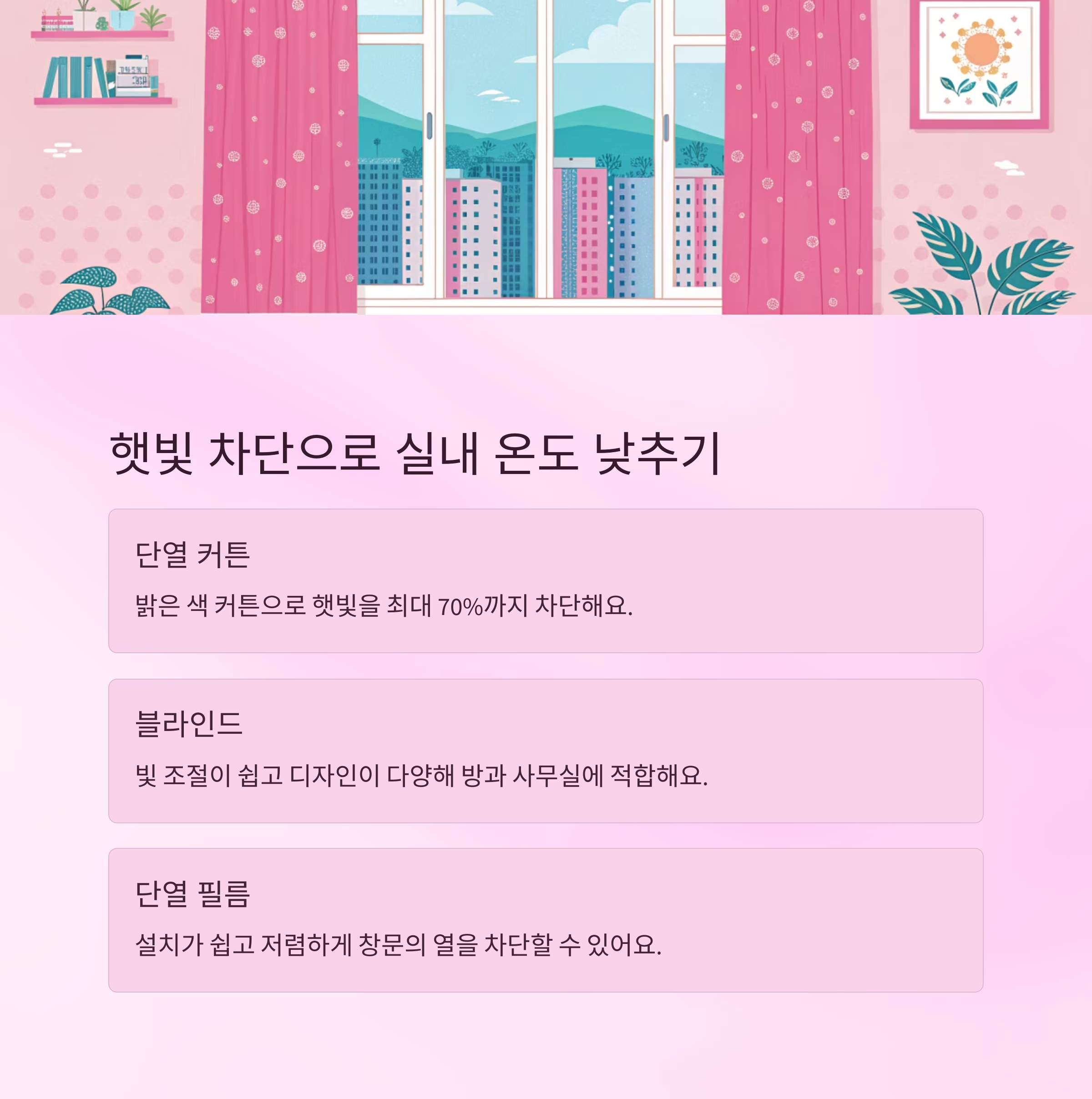커튼은 짙은 색보다는 밝은 색이 좋고, 외부에 반사 코팅이 되어 있으면 더 효과적이에요. 요즘은 단열필름도 많이 활용하는데요, 창문에 부착만 해도 자외선과 열 차단 효과가 있답니다. 설치도 간단해서 누구나 쉽게 할 수 있어요.