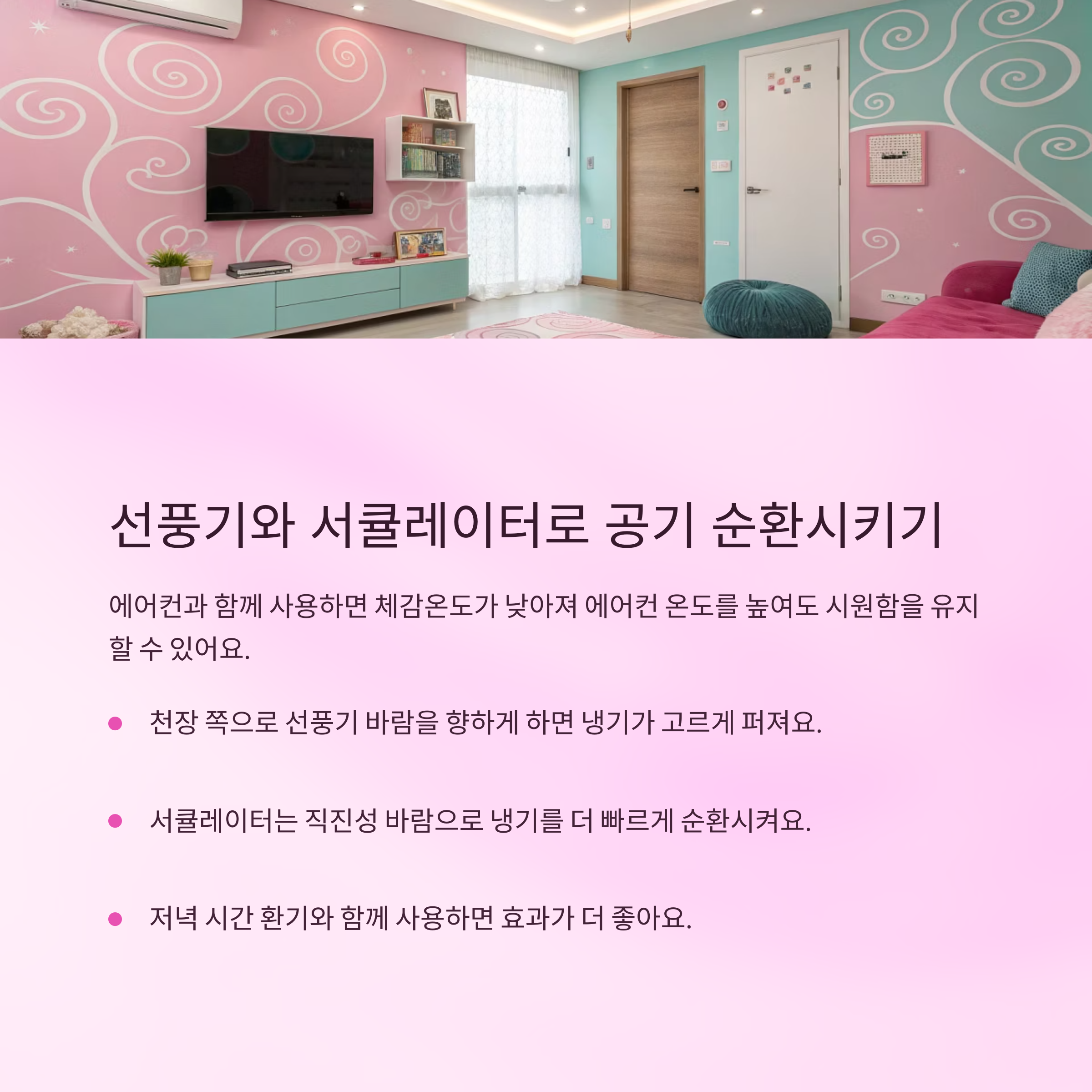 에어컨과 함께 사용하면 전기세를 아낄 수 있는 대표적인 아이템은 바로 선풍기예요. 선풍기를 단독으로 사용하는 것도 좋지만, 에어컨 바람을 방 안 전체로 골고루 퍼뜨리기 위해 함께 쓰면 에너지 효율이 더 올라가요. 이런 식으로 두 기기를 함께 사용하면 설정 온도를 올려도 시원하게 느껴져요.