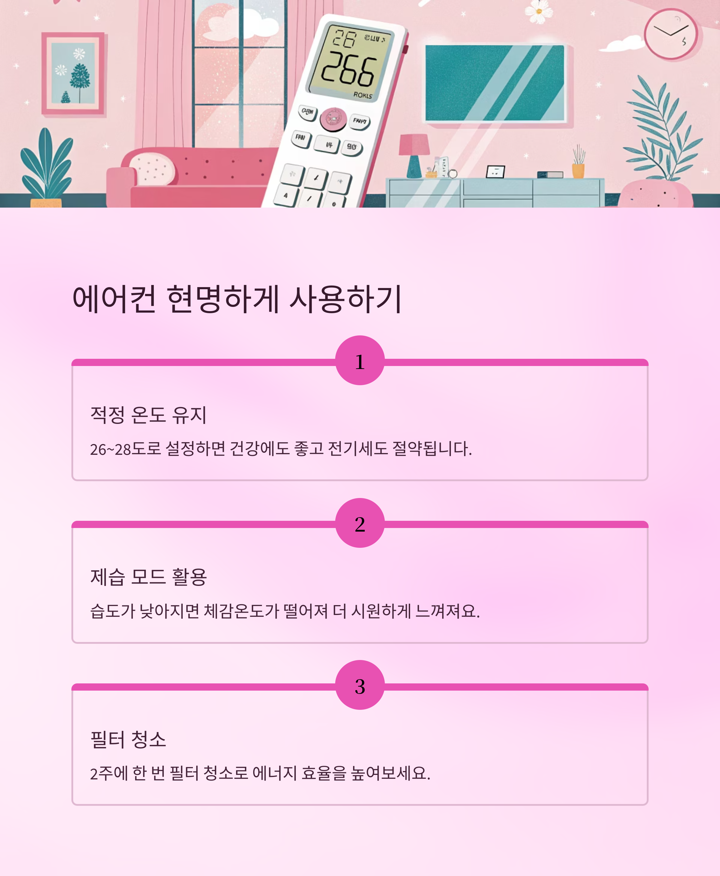 또한 에어컨을 켤 땐 ‘제습’ 모드를 적극 활용해보세요. 습도가 낮아지면 체감온도가 뚝 떨어져 시원함을 더 강하게 느낄 수 있어요. 특히 장마철이나 땀이 많은 날에는 제습이 효과적이에요. 실외기를 그늘지게 하고, 필터를 청소하는 것도 전기 절약에 도움이 돼요.