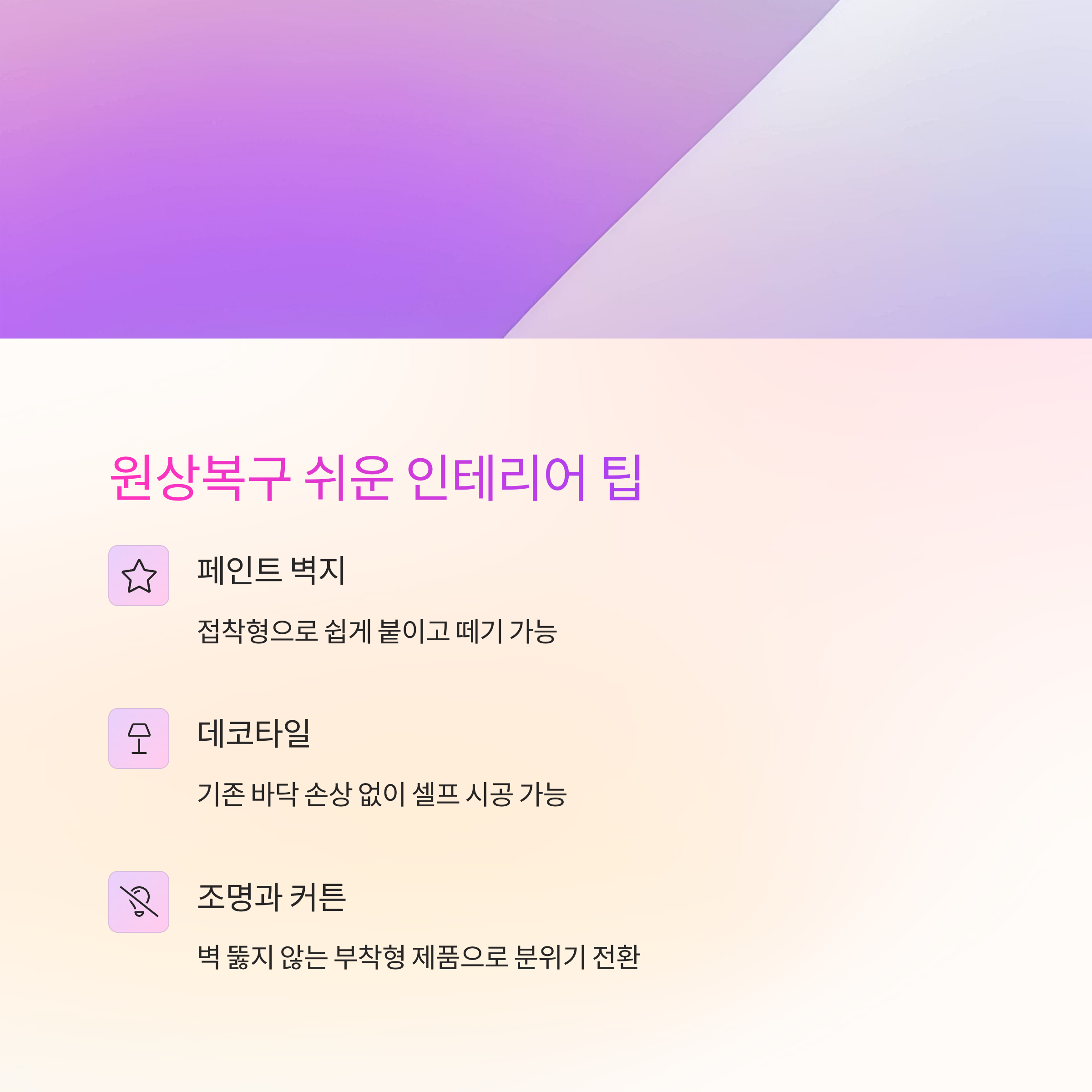 게다가 요즘은 집주인과 협의 하에 간단한 인테리어는 허용해주는 경우도 많고, 셀프 시공 제품들이 원상복구도 쉽게 만들 수 있도록 설계되어 있어요. 무조건 안 된다고 단정짓기보다는, 가능성을 열고 내 공간을 좀 더 따뜻하게 바꿔보는 거예요. 🙂